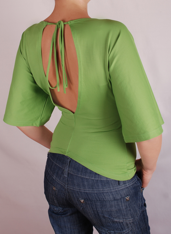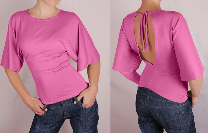 Блуза с широки кимоно ръкави и прибрано обло деколте и гол гръб с връзки