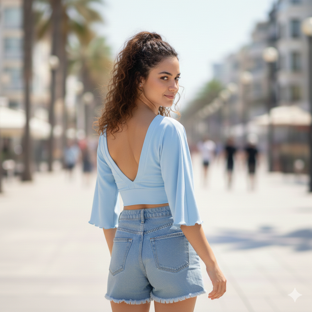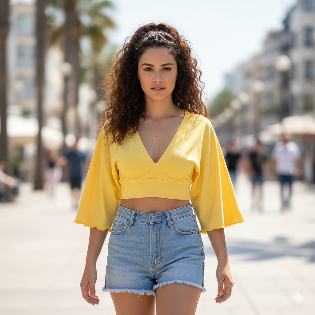 Лятна блуза с широки ръкави като пеперуда. Блузата е с красиво шпиц деколте и по същия начин изрязан гръб и висока талия. Дължината на блузата е под бюста.