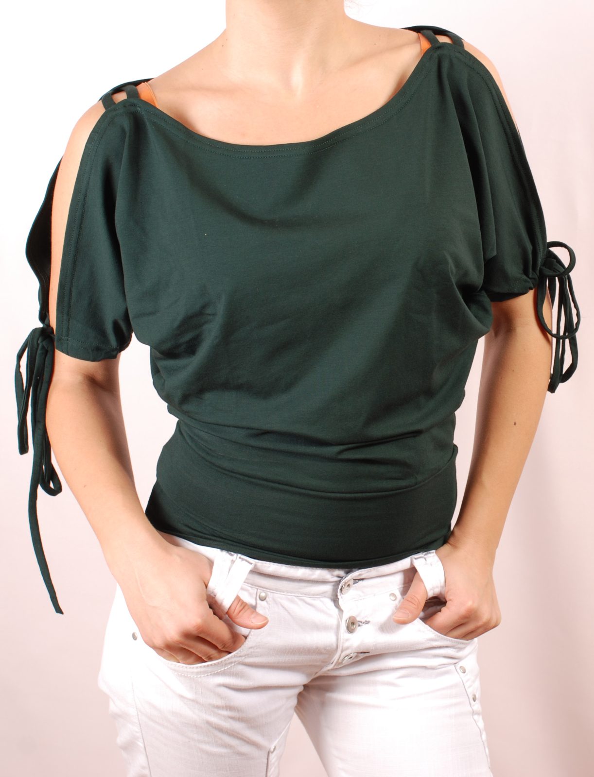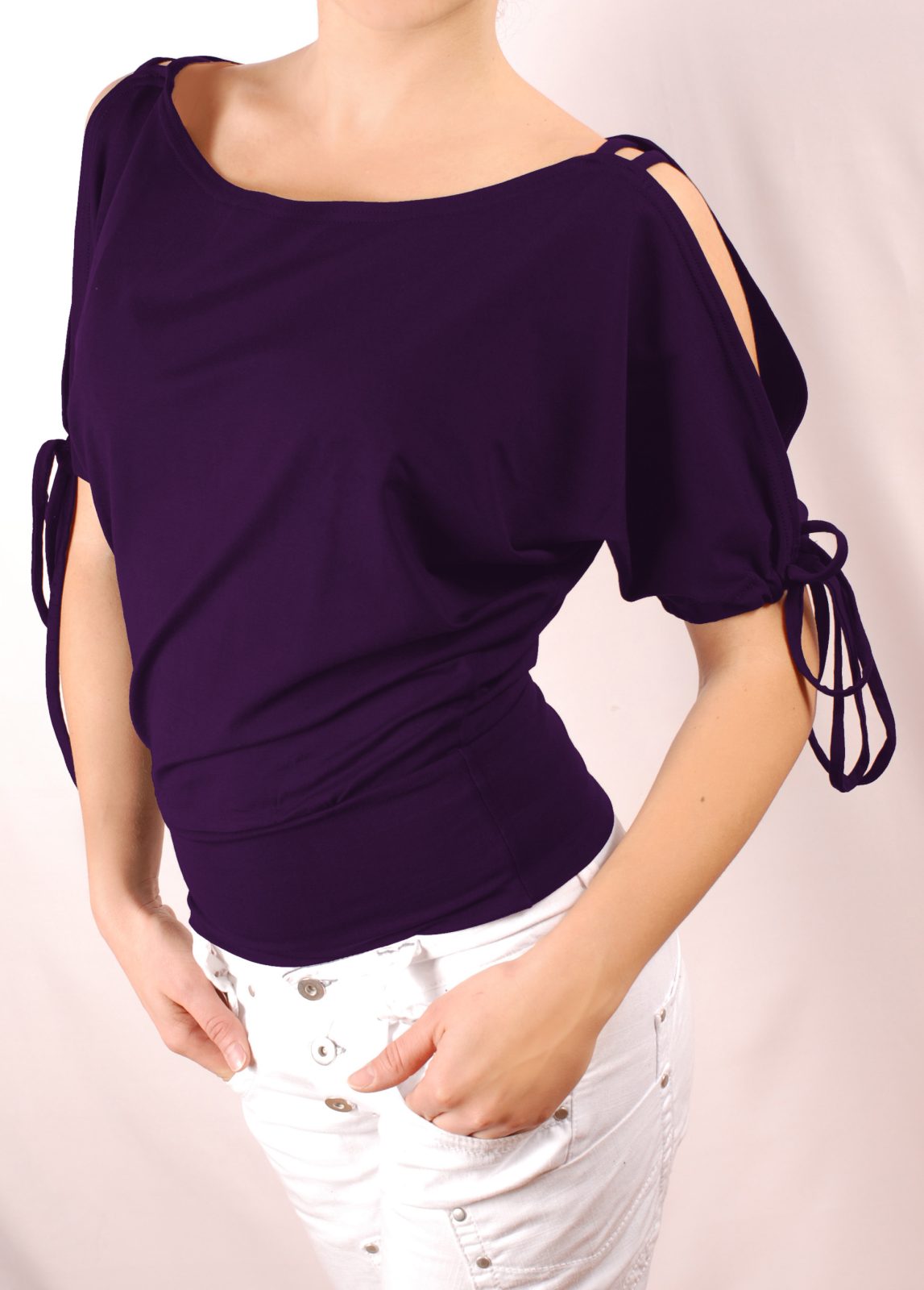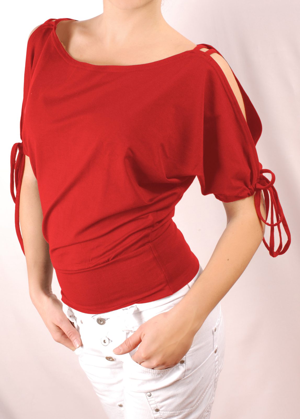Дамска блуза с къс прилеп ръкав, отворен на раменете и с връзки над лактите. Блузата се изпълнява в 28 цвята и размери S, M, L, XL, XXL или зададени от вас мерки