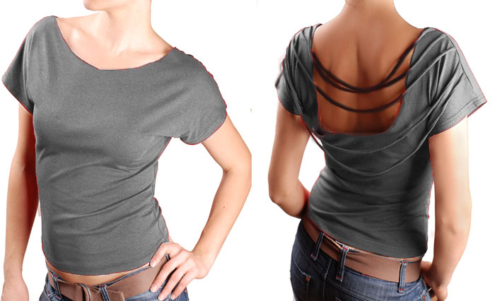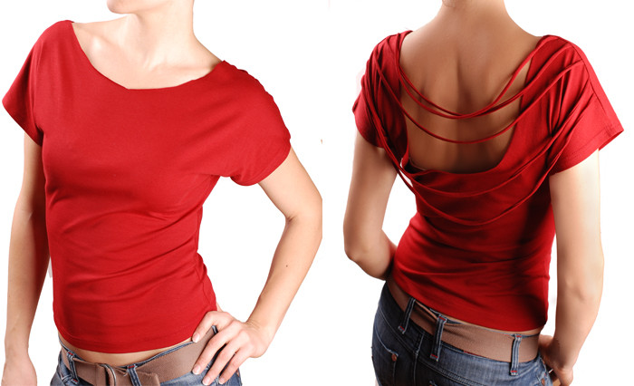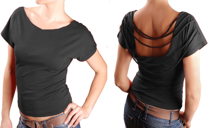 Весела лятна блуза със закачливо изрязан гръб и въженца. Блузата е без подгъв на деколтето и гърба, но по Ваше желание може да се подгънат. Необходимо е само да ни пишете в полето за коментар при поръчка.