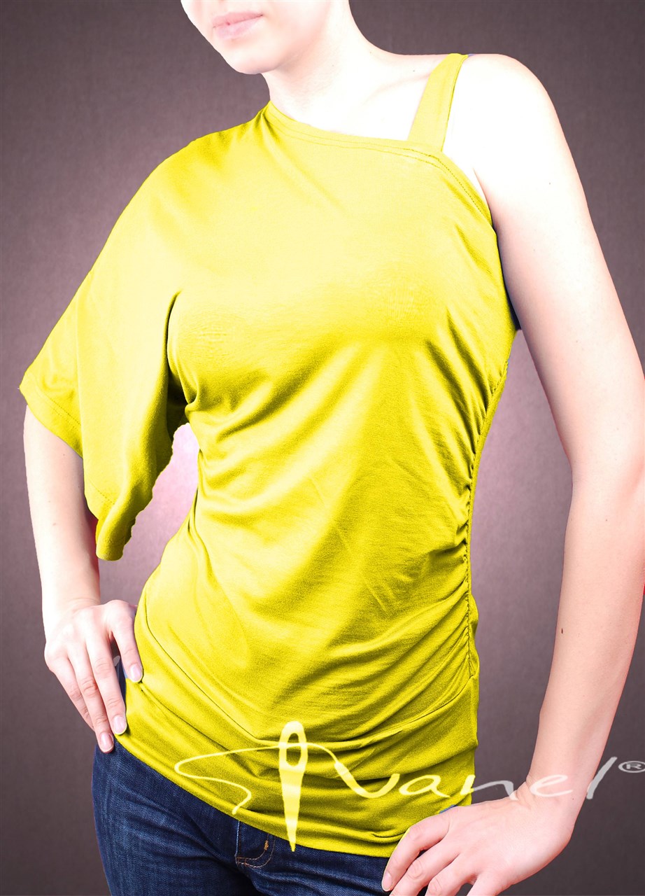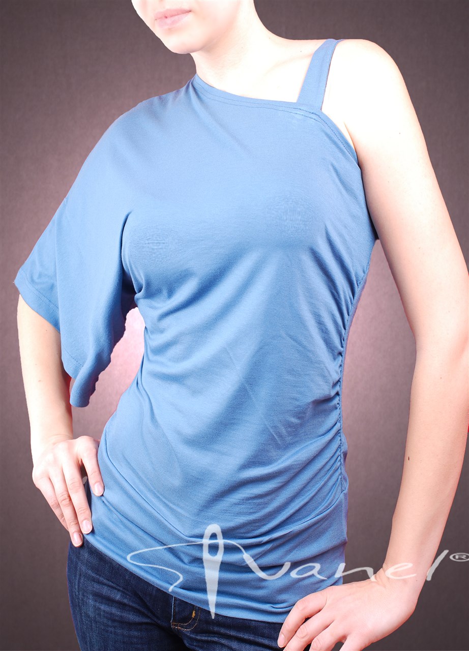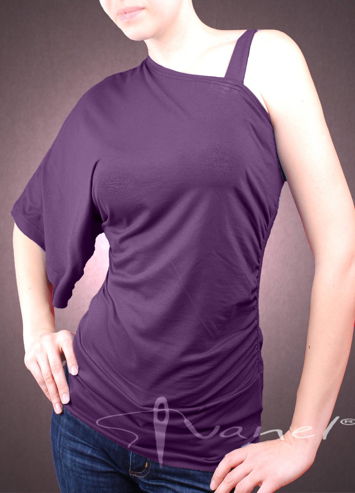 Блуза с едно голо рамо и един ръкав тип кимоно. Блузата се изпълнява в 28 цвята и размери S, M, L, XL, XXL или зададени от вас мерки