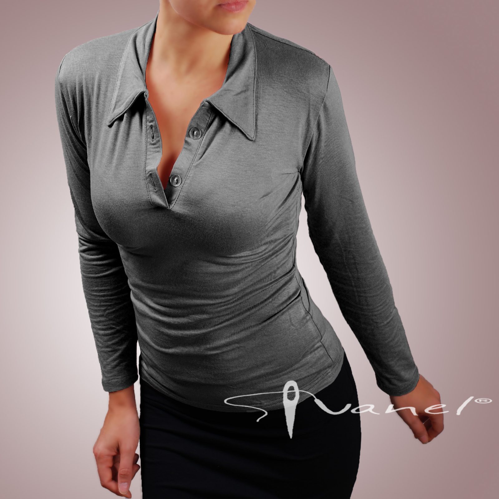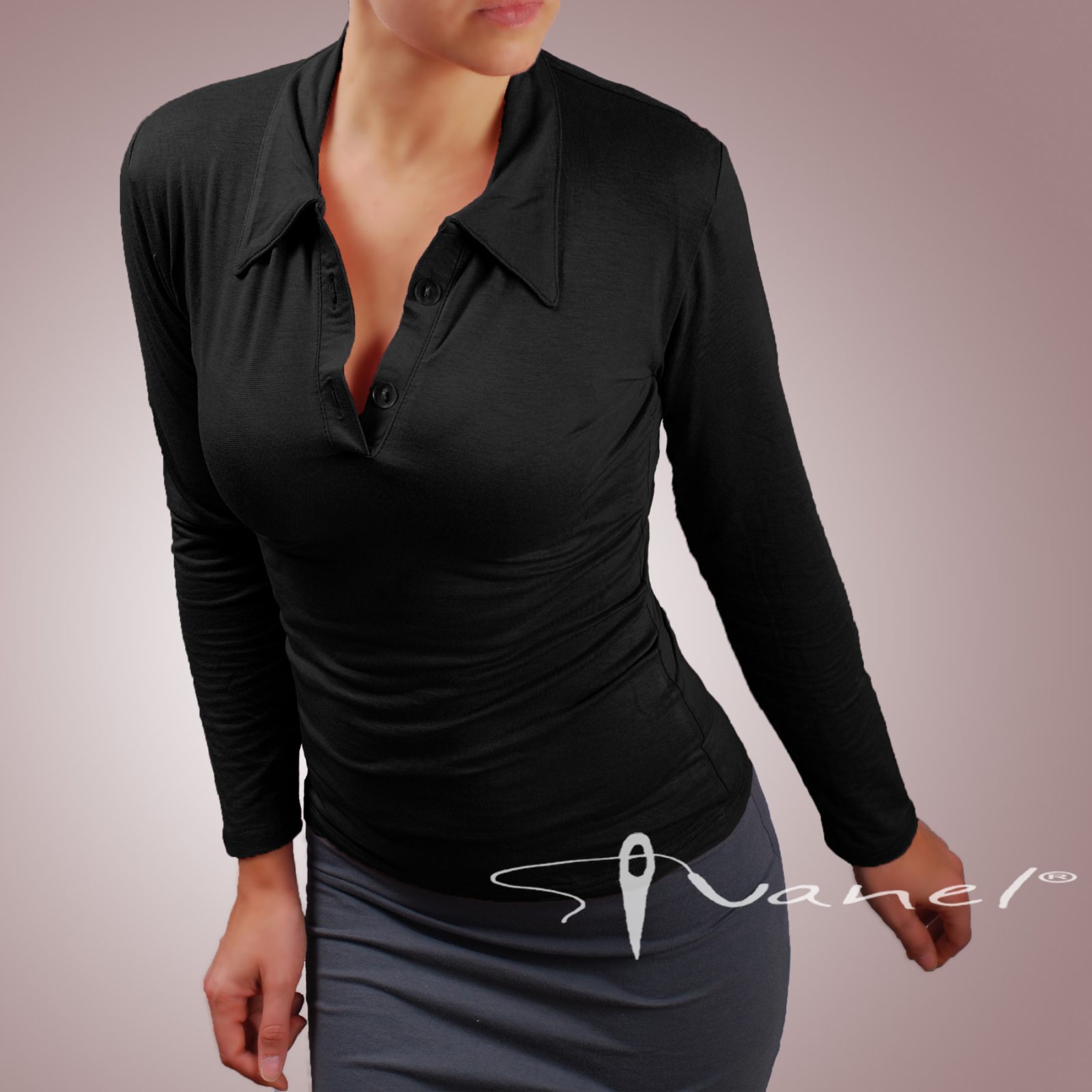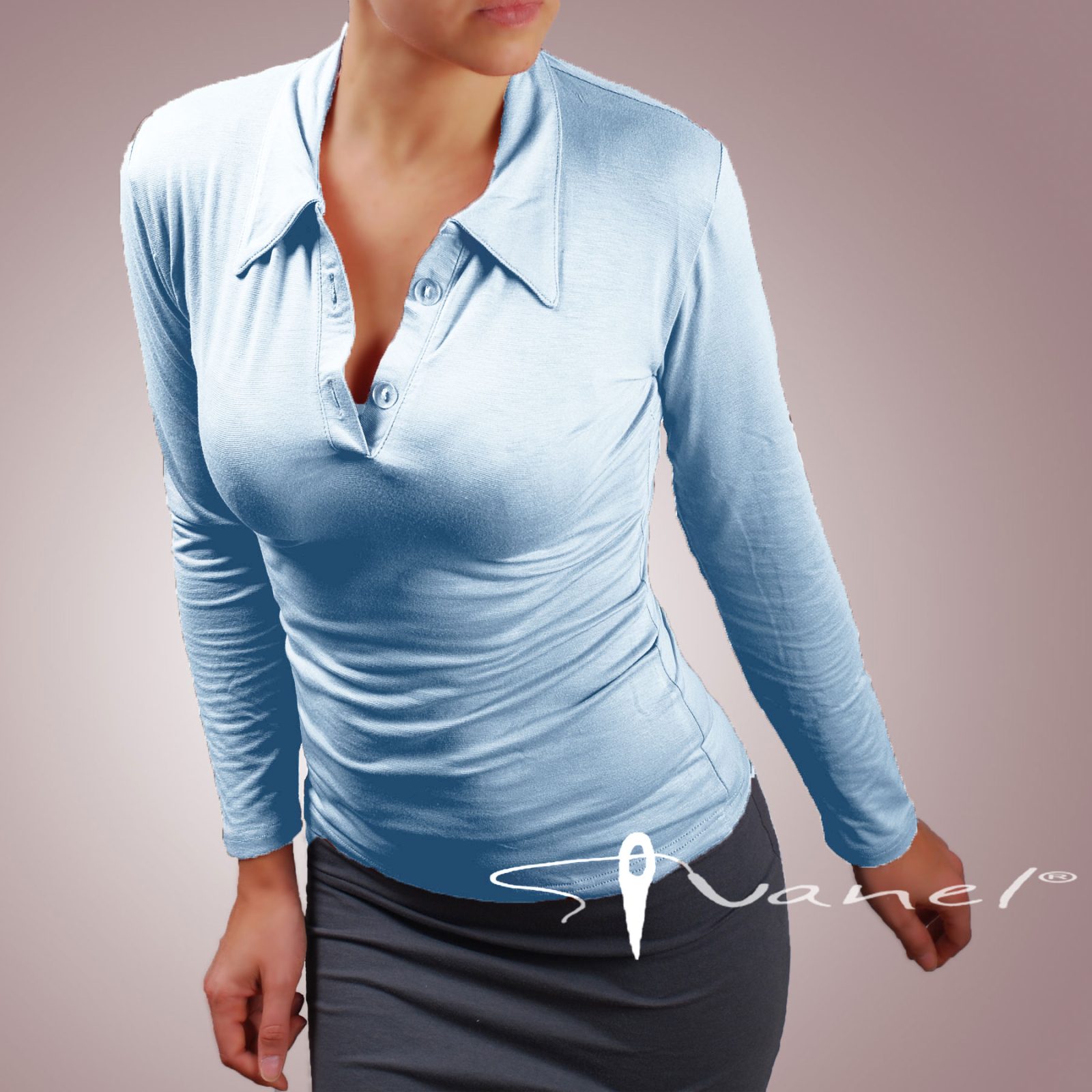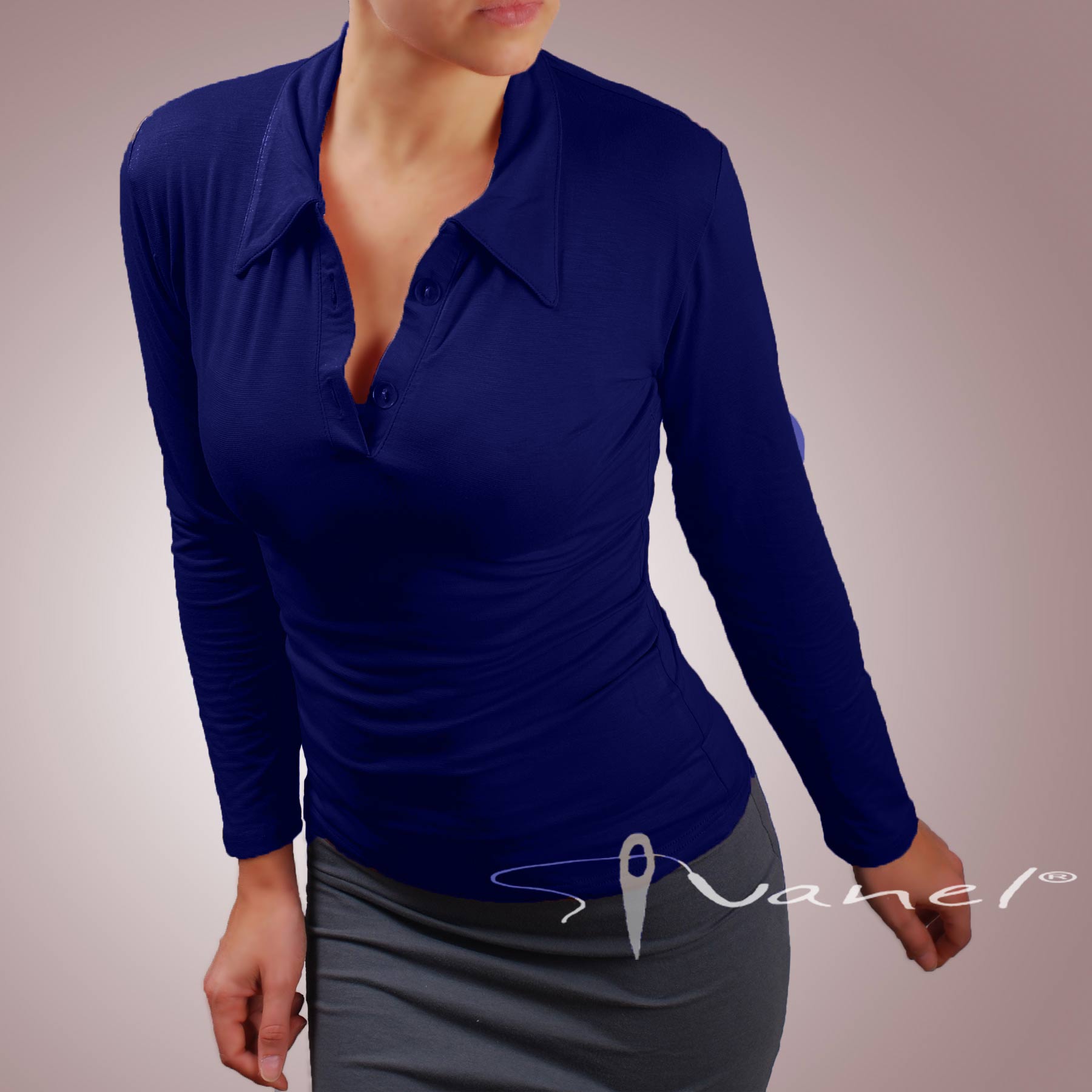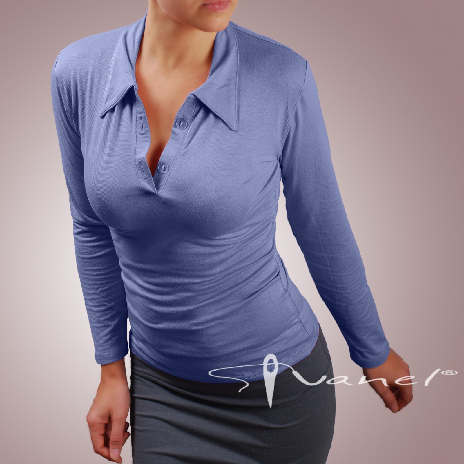 Блуза с копчета на деколтето и якичка с дълъг ръкав. Блузата е с шпиц деколте и се изпълнява в 28 цвята и размери S, M, L, XL, XXL или зададени от вас мерки