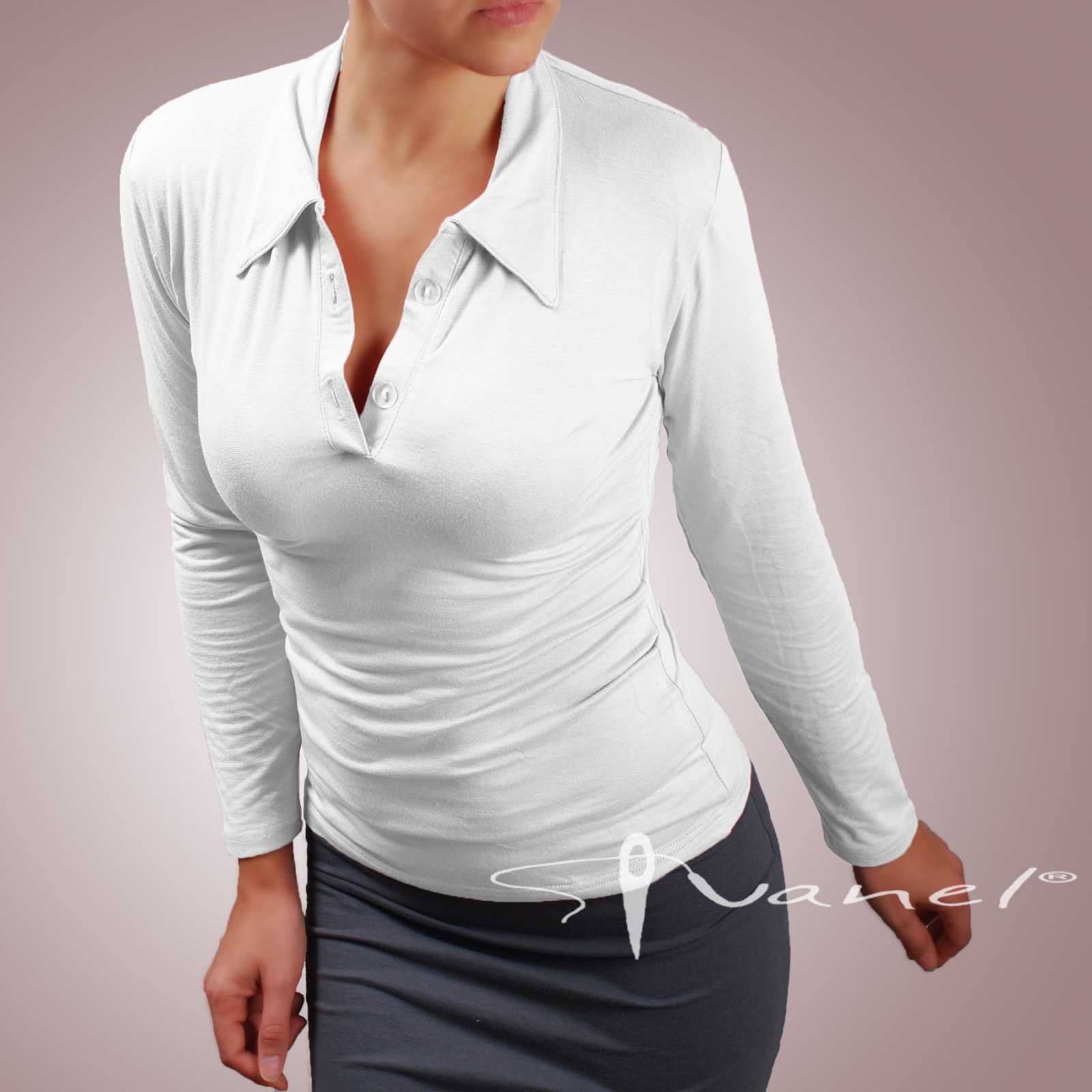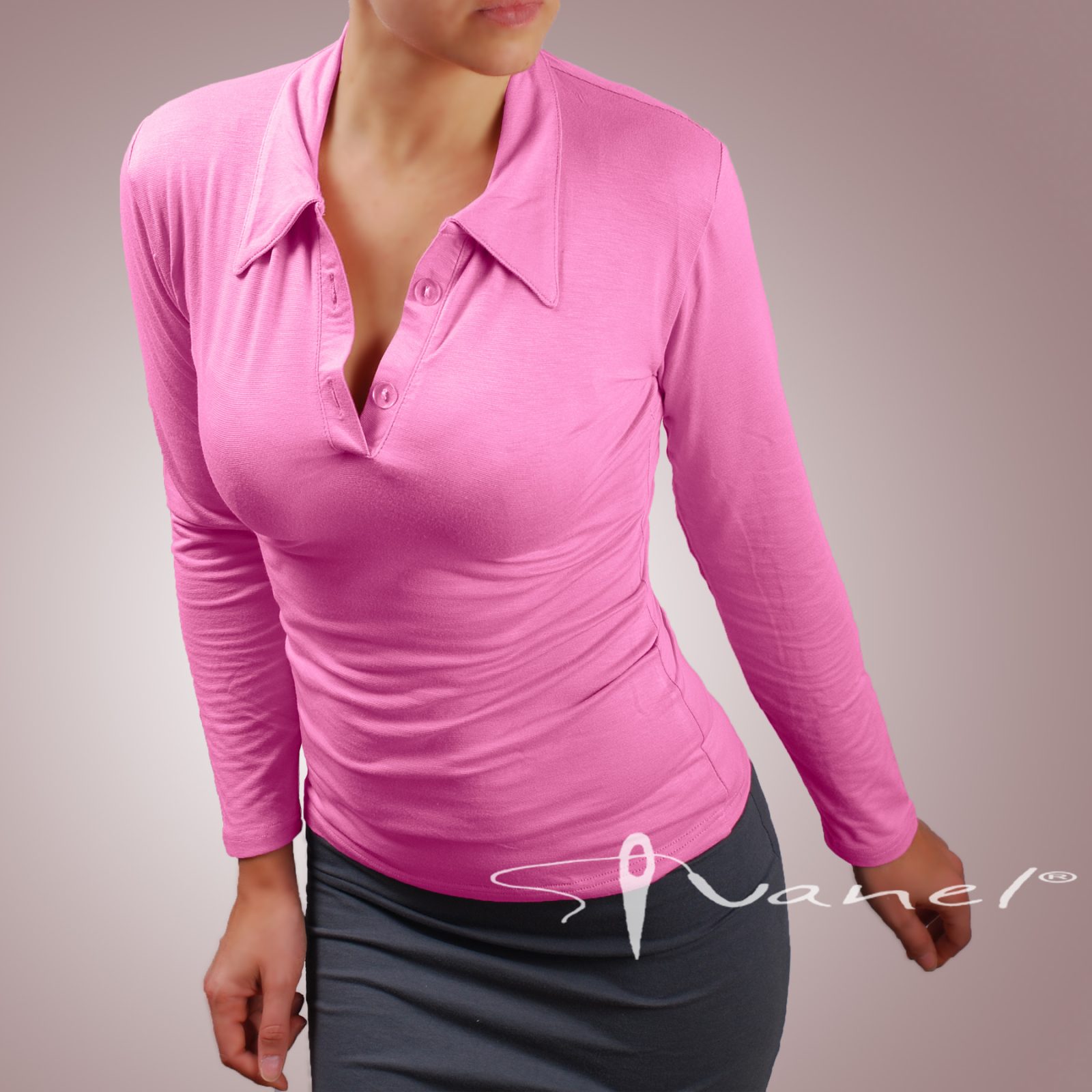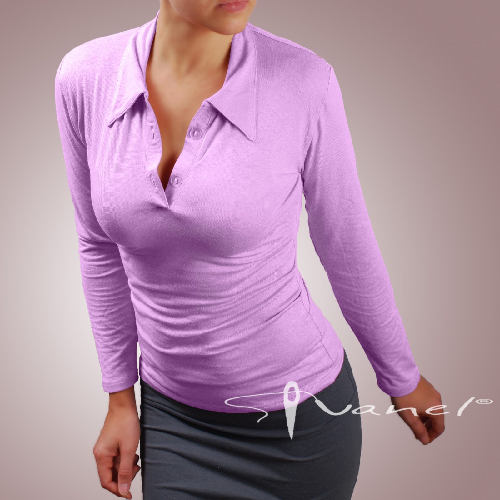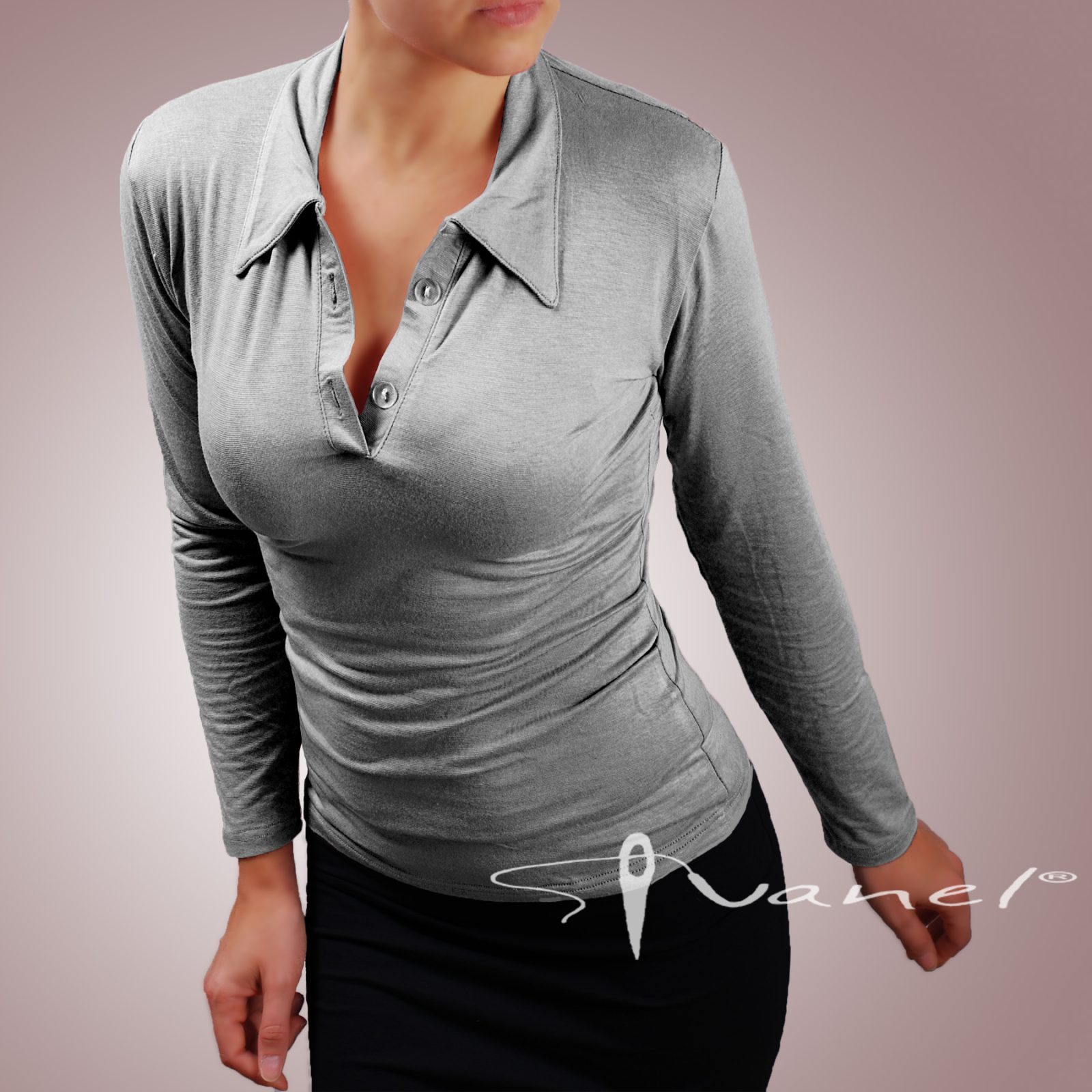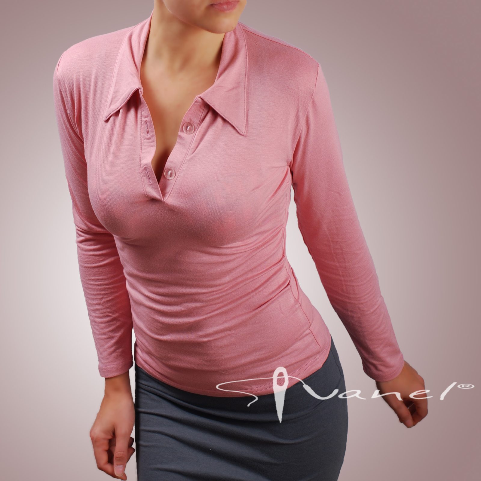 Блуза с копчета на деколтето и якичка с дълъг ръкав. Блузата е с шпиц деколте и се изпълнява в 28 цвята и размери S, M, L, XL, XXL или зададени от вас мерки