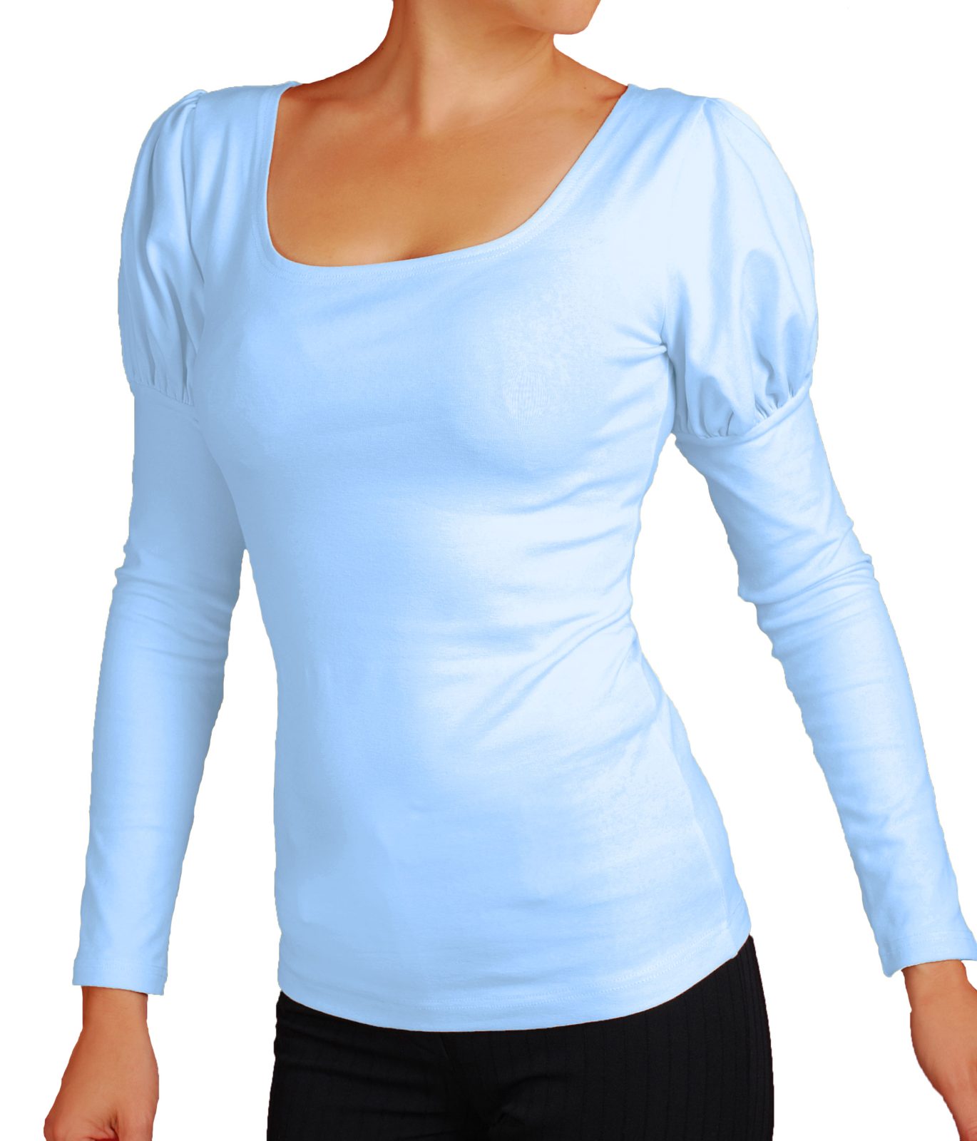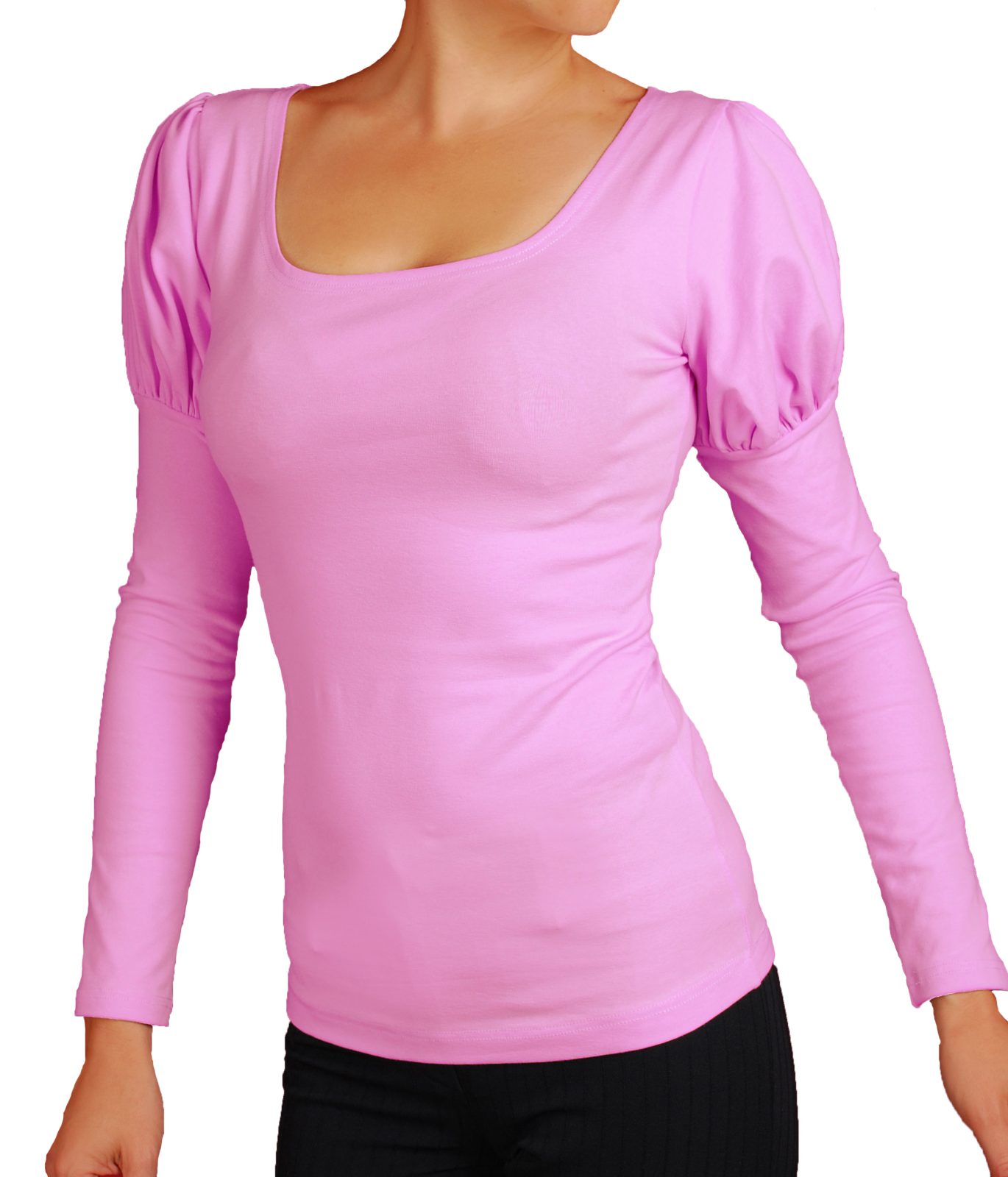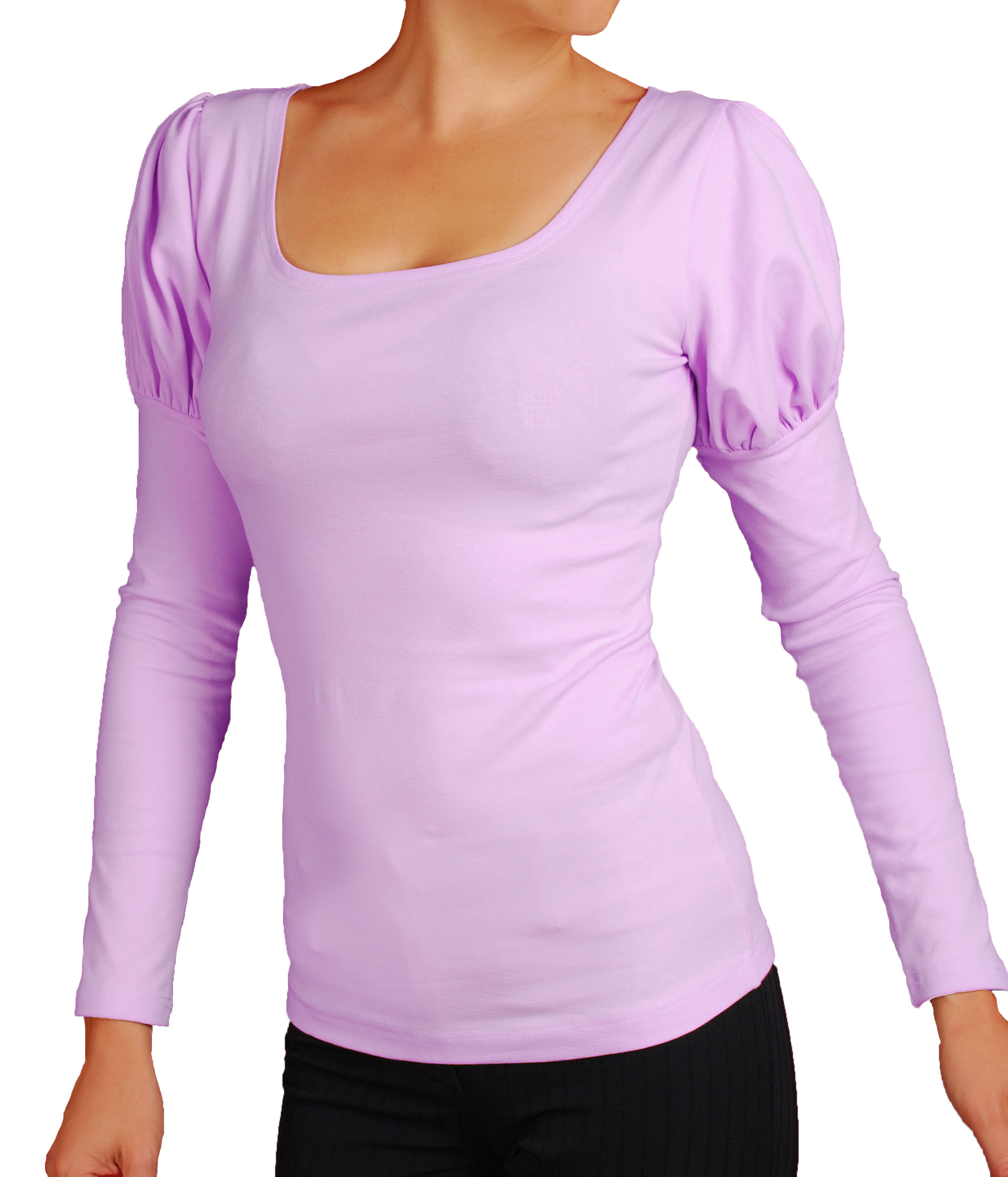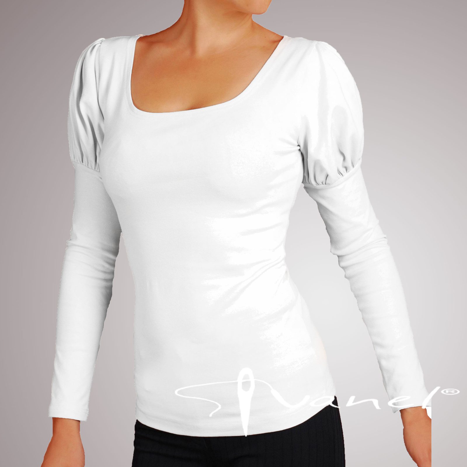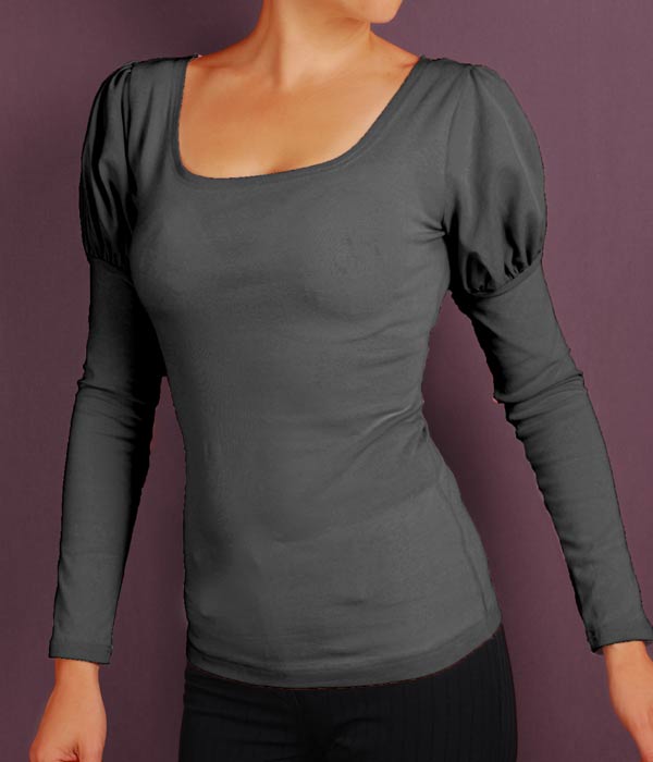 Дамска блуза с красиви обемни рамена и дълги ръкави. Деколтето на блузата е обло.