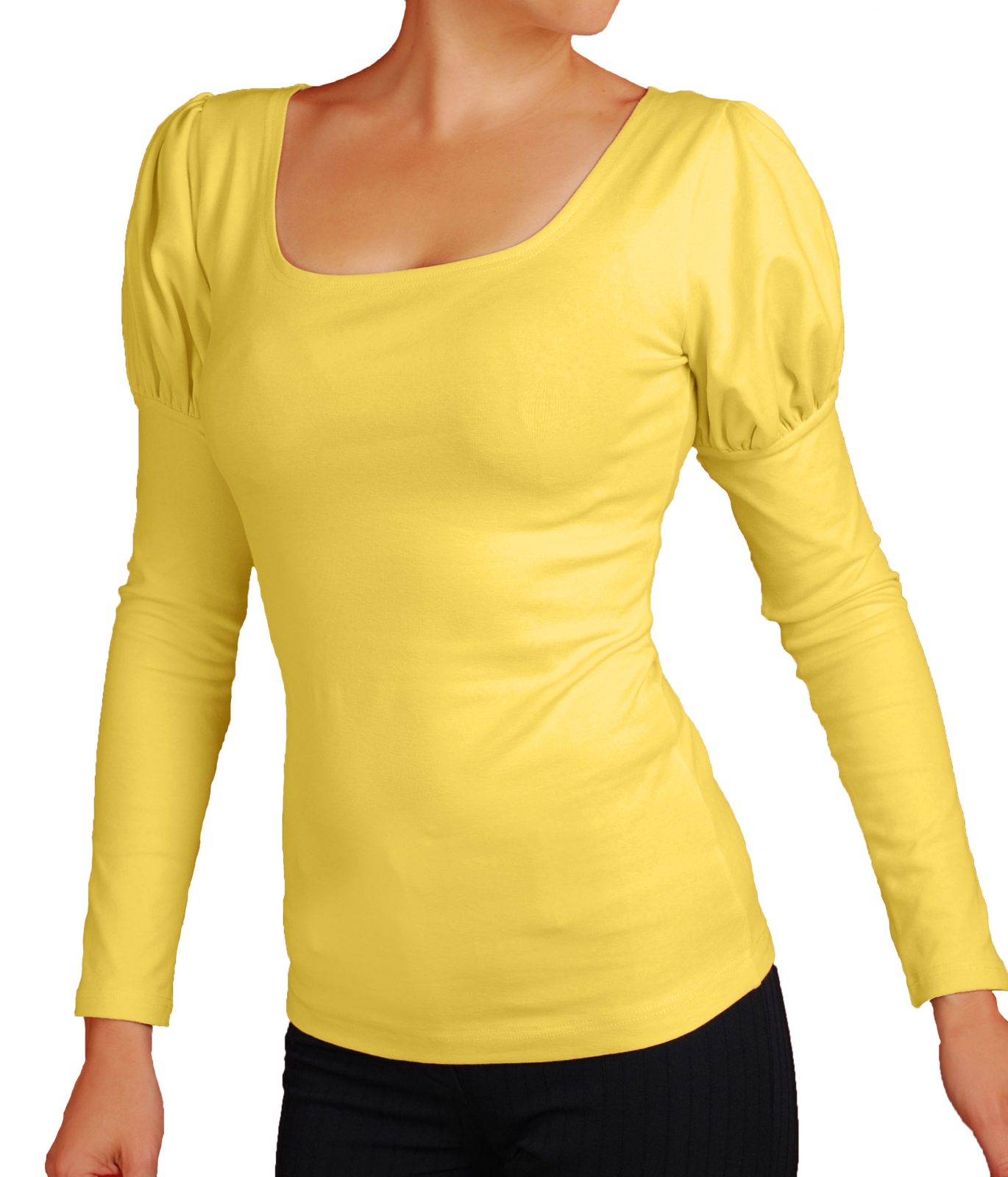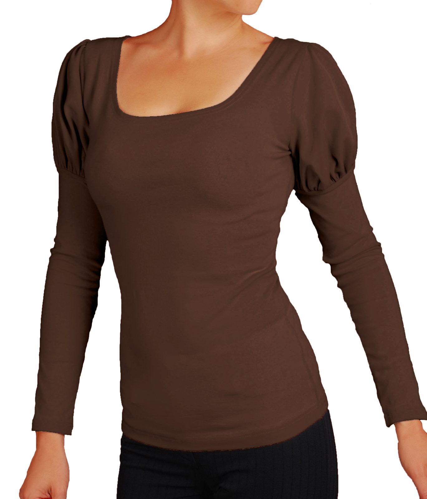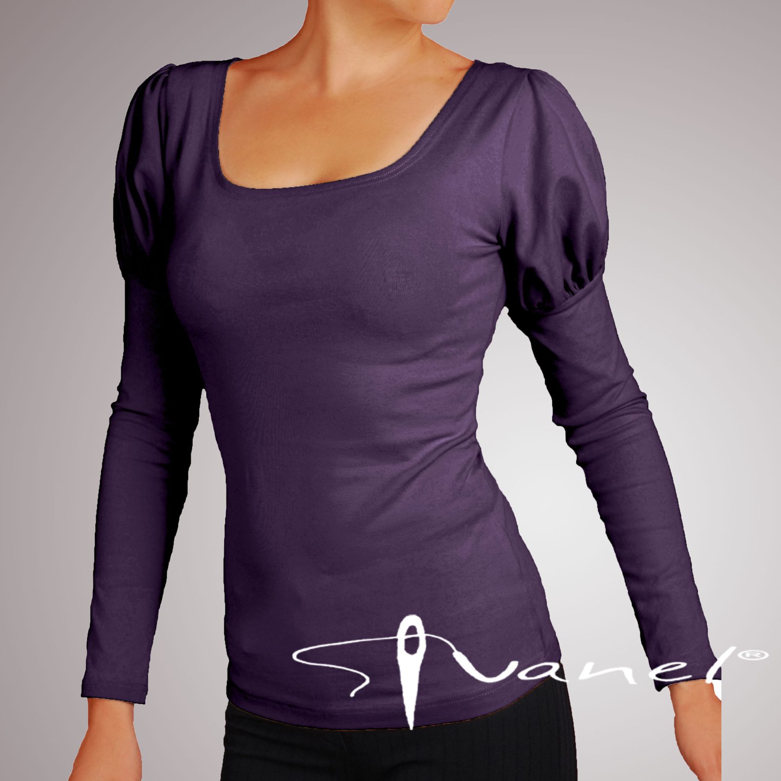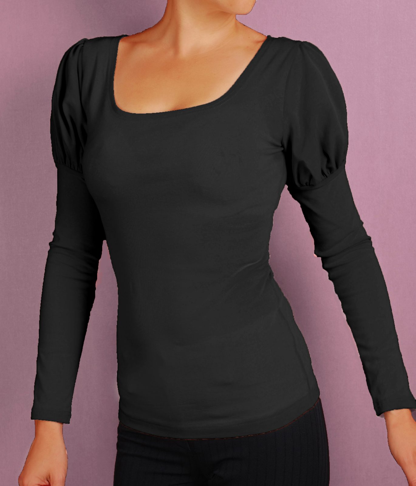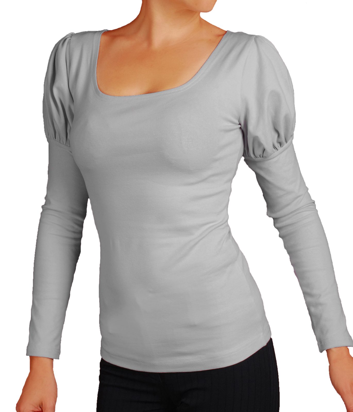 Дамска блуза с красиви обемни рамена и дълги ръкави. Деколтето на блузата е обло.