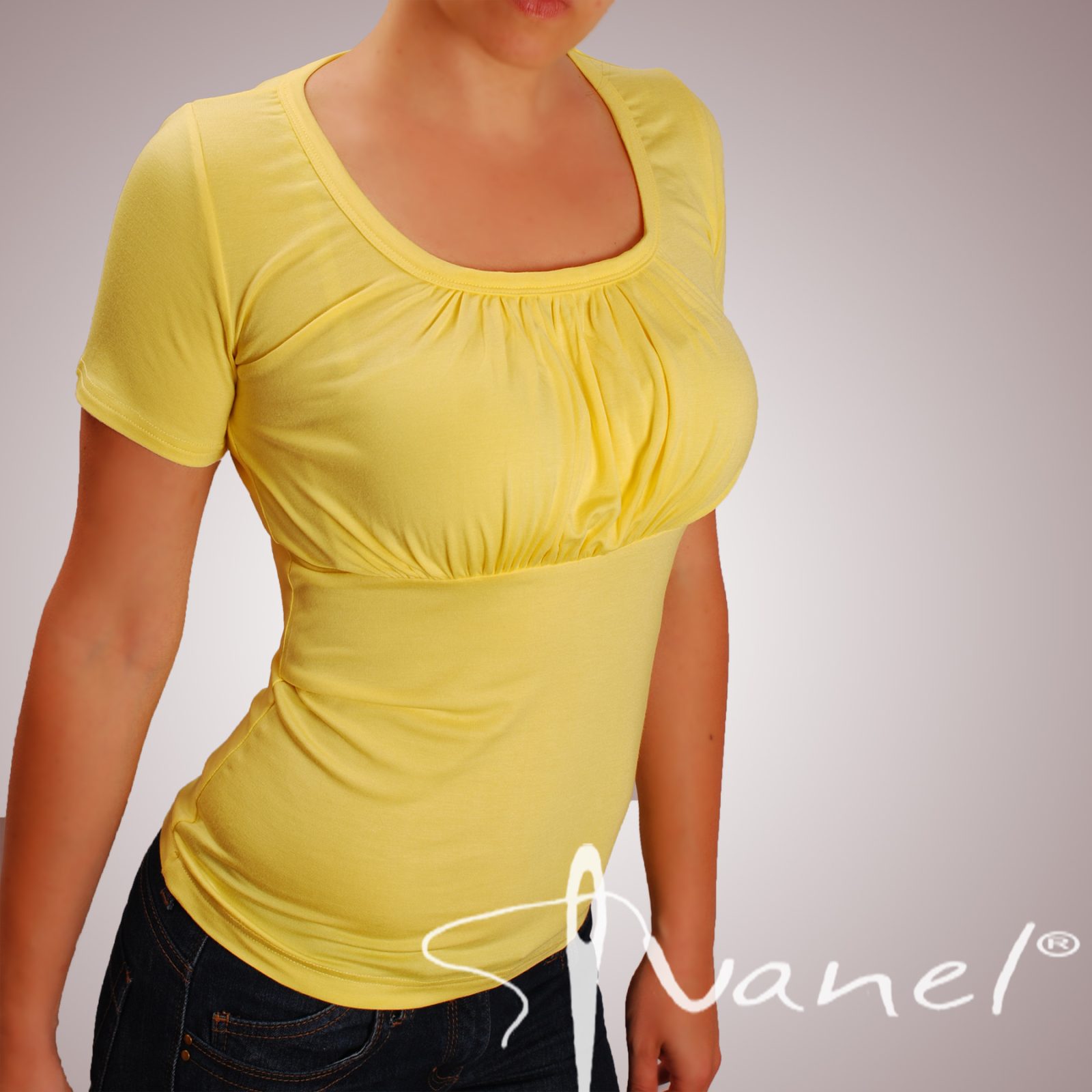 Блуза с обемно и обло деколте с къс ръкав. Блузата се изпълнява в 28 цвята и размери S, M, L, XL, XXL или зададени от вас мерки