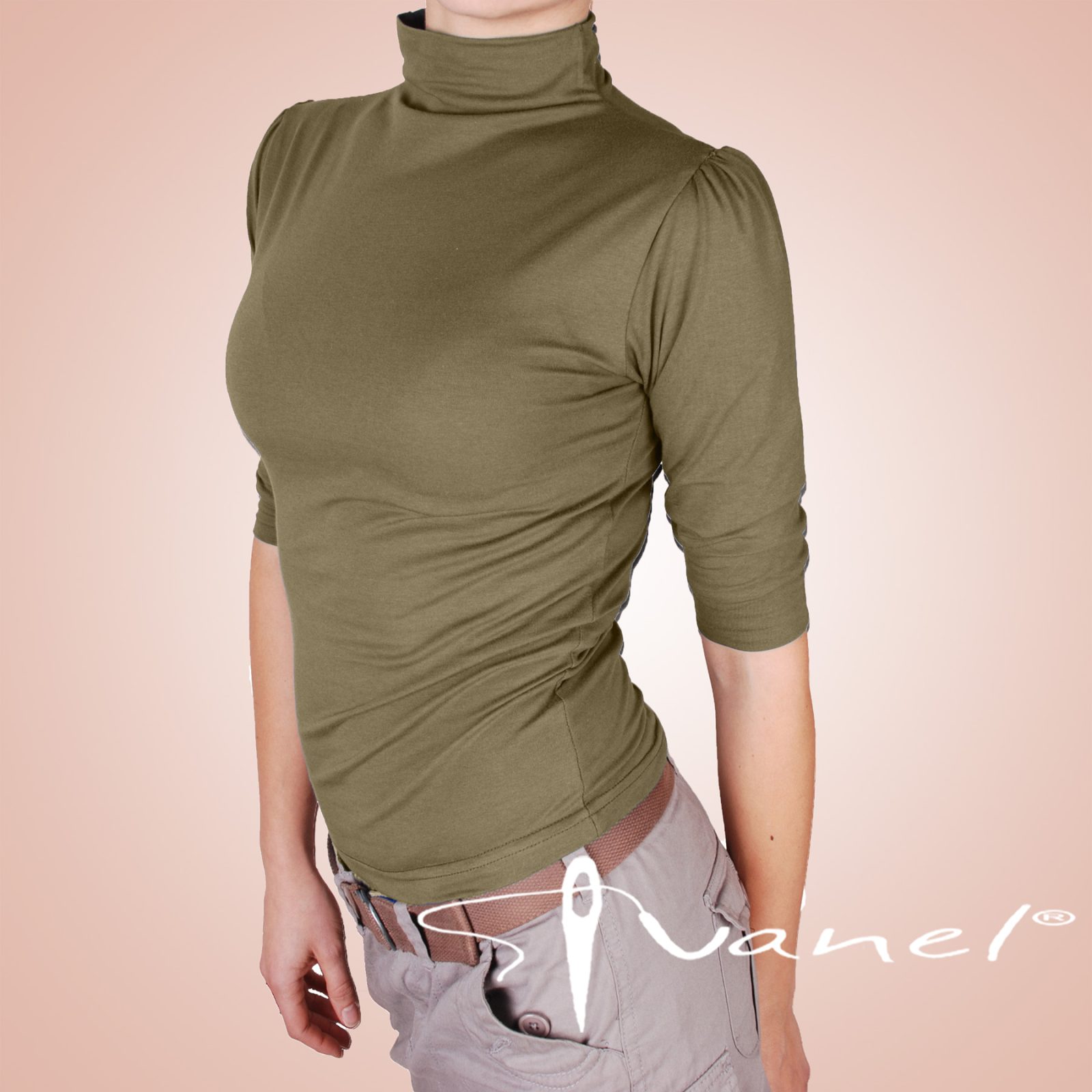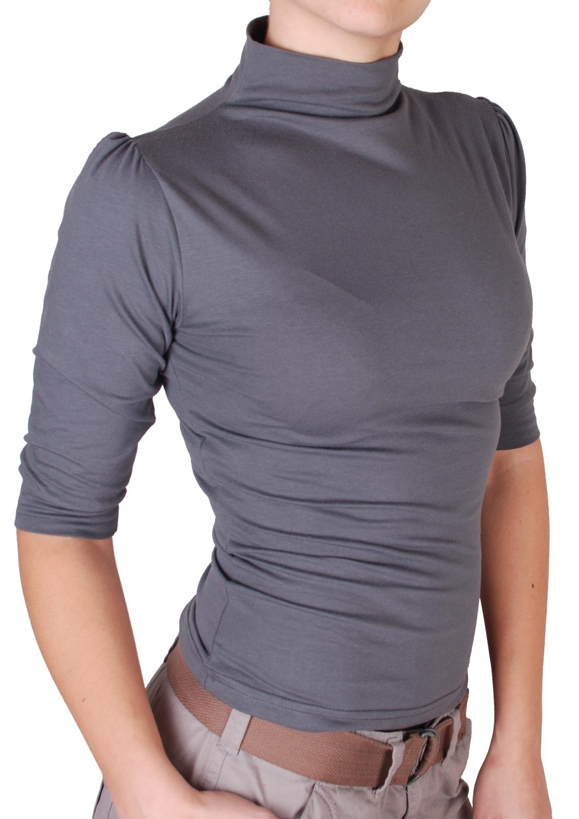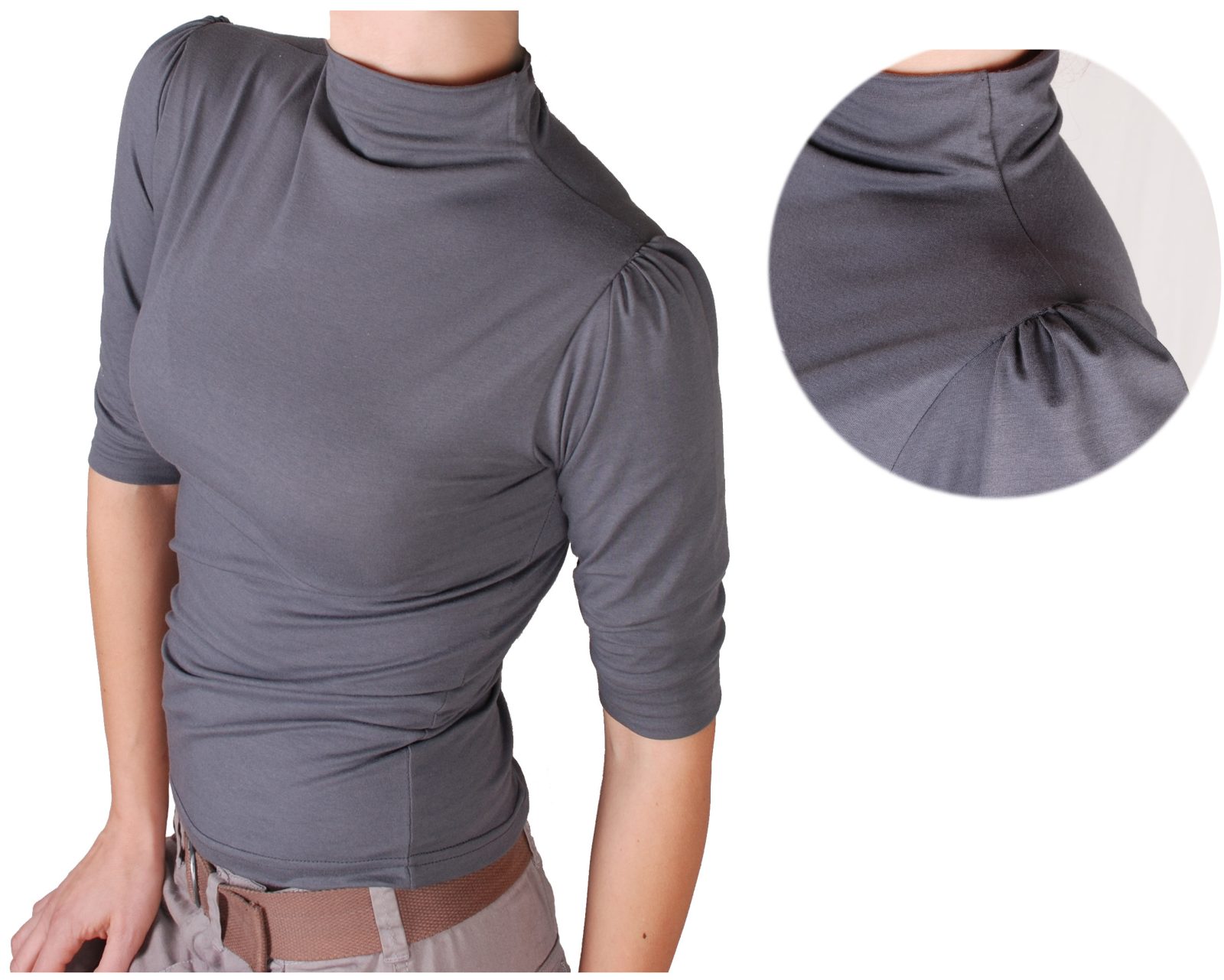Дамска блуза с поло без шевно свързано към блузата. Ръкавите са 3/4 дължина и са тип буфан на раменете.