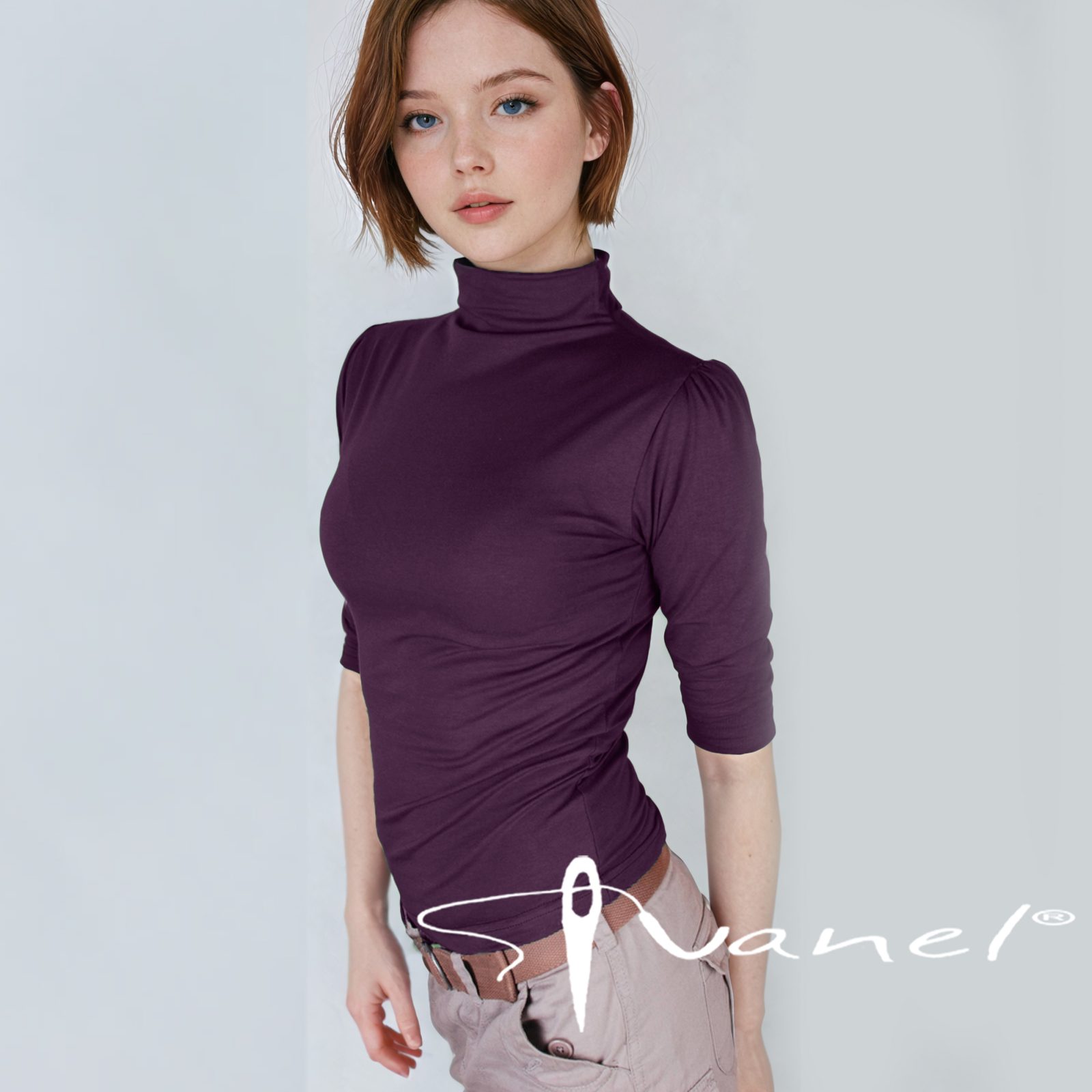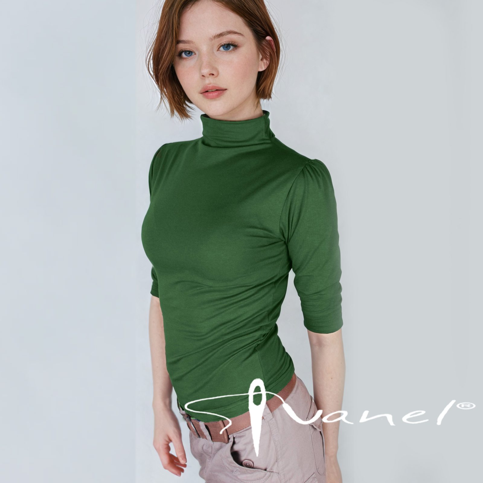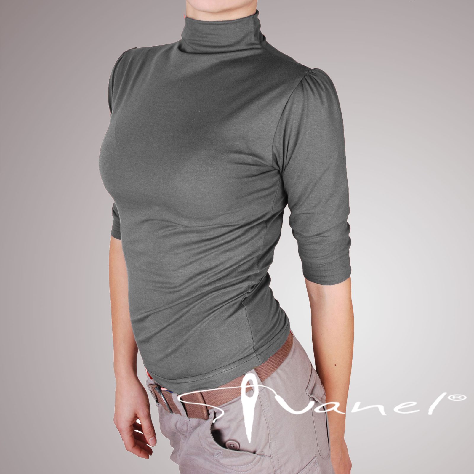 Дамска блуза с поло без шевно свързано към блузата. Ръкавите са 3/4 дължина и са тип буфан на раменете.