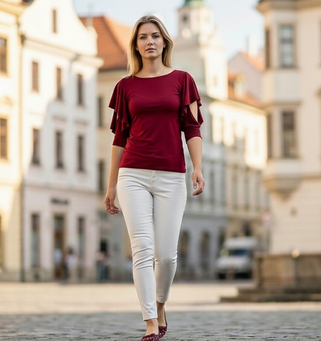 Дамска блуза с красиви ефектни набрани ръкави, падащи нежно под раменете. Блузата е с голи рамена с нежно падащи и красиво набрани ръкави. Едното рамо е голо с тънка презрамка, а другото рамо е покрито. Ръкавите са широки, но в края се стесняват в маншет. Дължината на ръкавите е до лактите, а деколтето е тип гръцко деколте.