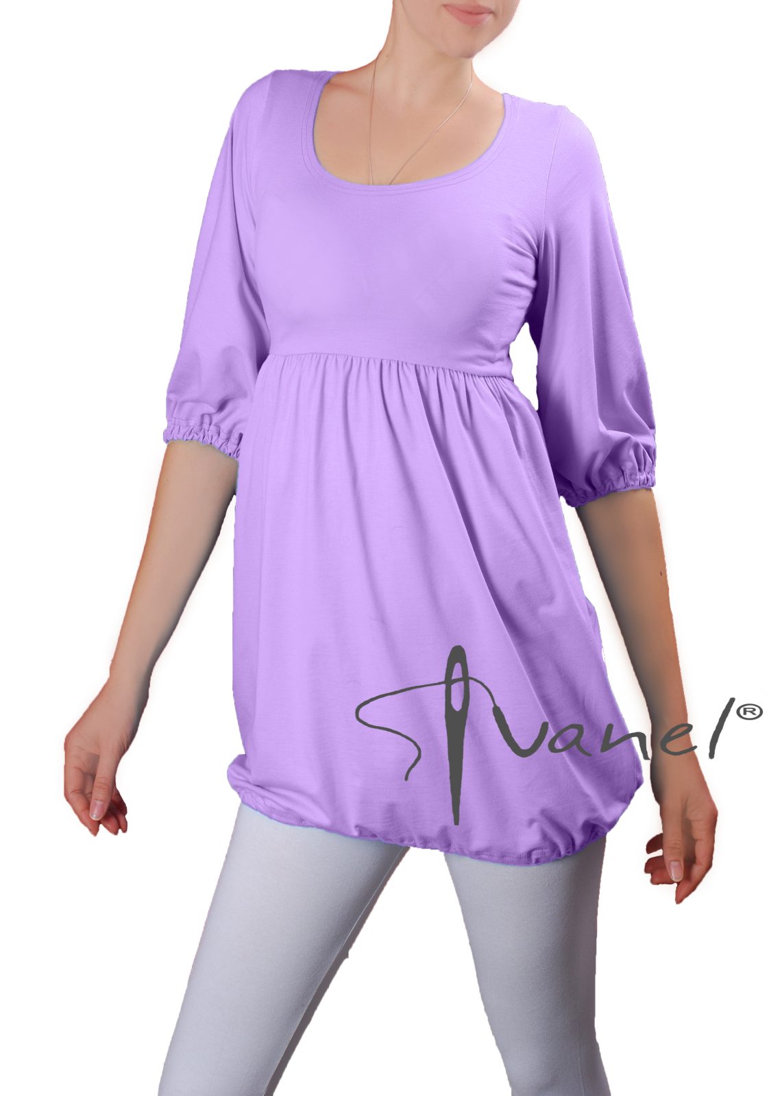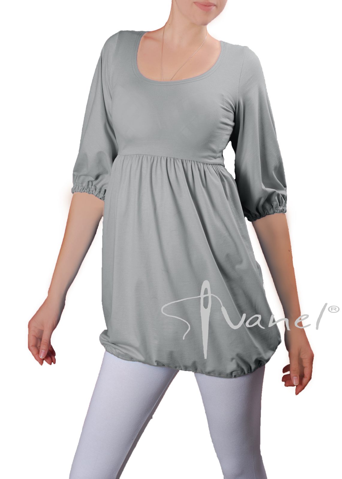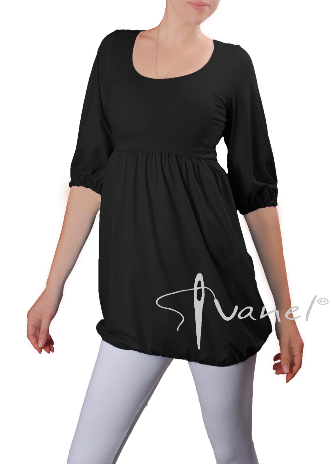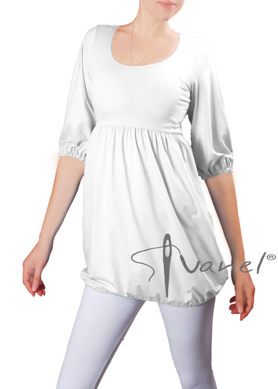 Дамска блуза с трансформираща се дължина в туника с набор под бюста и широк обем надолу. Ръкавите са под лакът и са широки, завършващи с ластик.