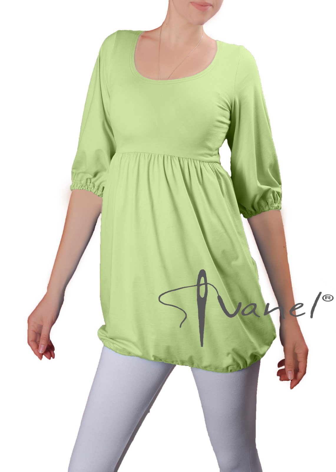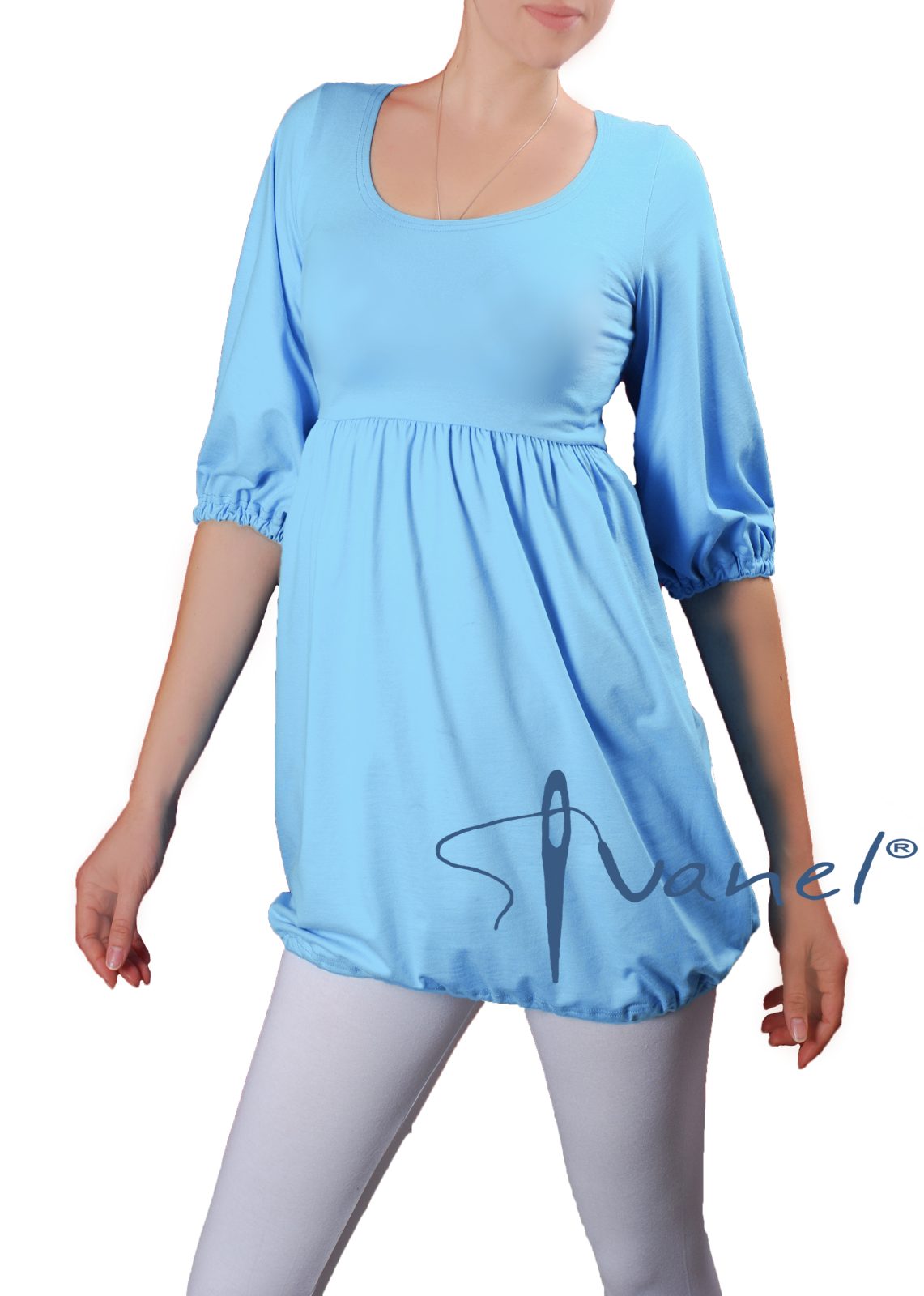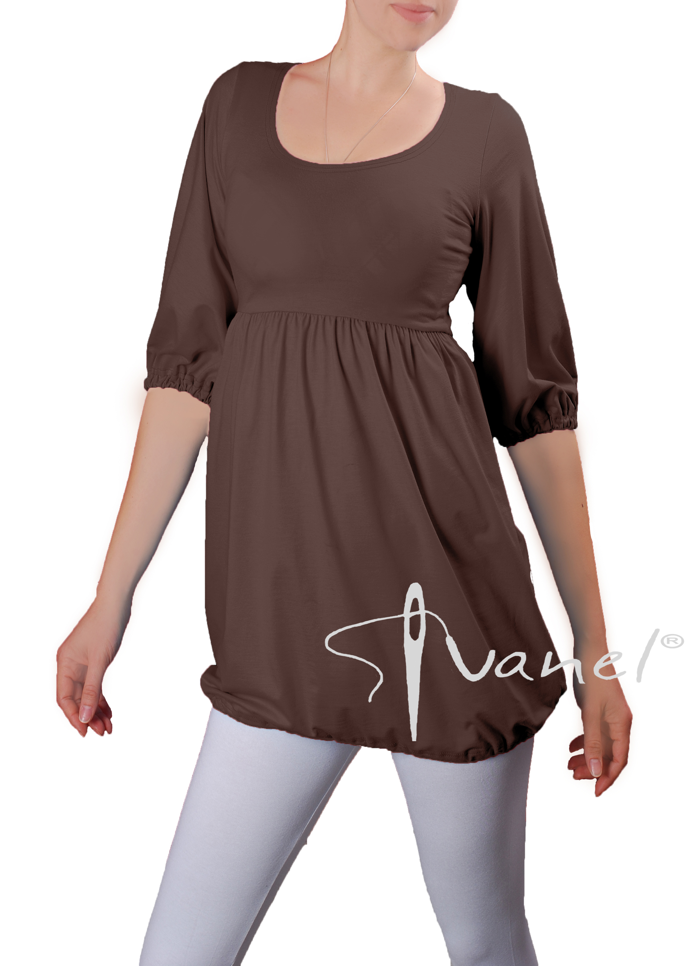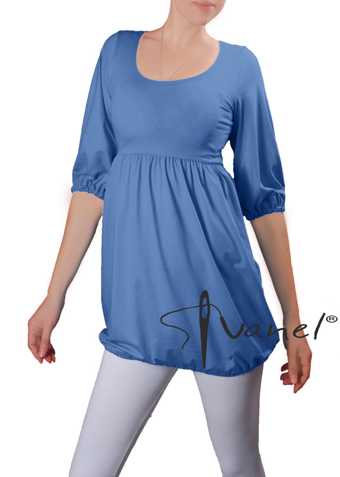 Дамска блуза с трансформираща се дължина в туника с набор под бюста и широк обем надолу. Ръкавите са под лакът и са широки, завършващи с ластик.