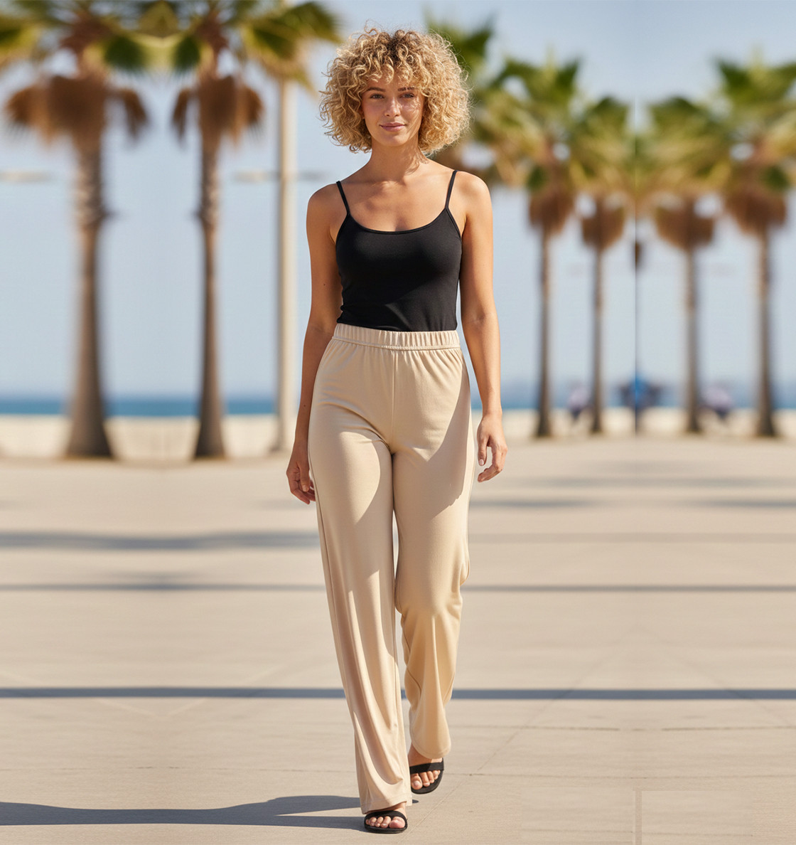 Панталонът е с нежни връзки на талията. Крачолите са прави. Подходящ за спортни занимания или за удобното ежедневие.Дамски панталон от трико, еластичен.