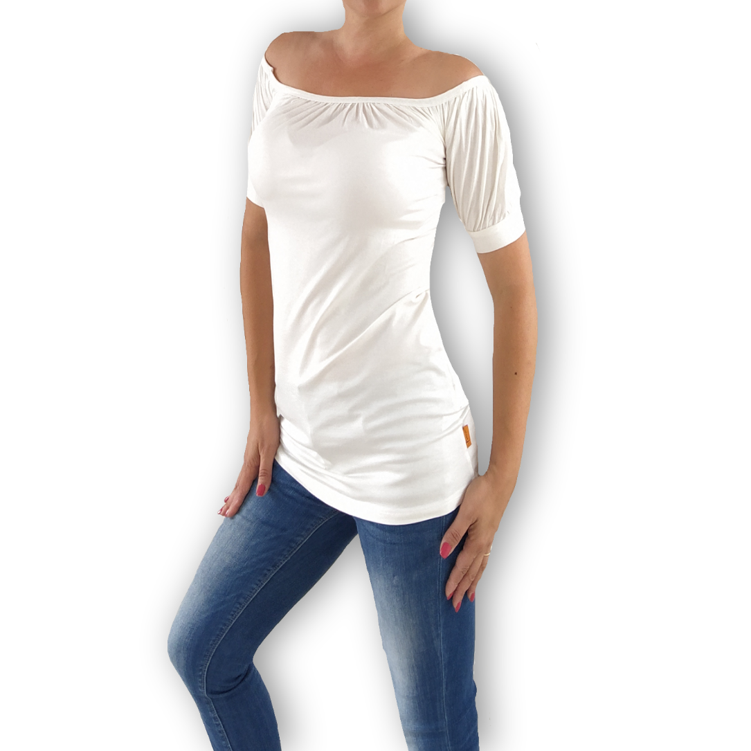 Туника с набрано бие, късо набрано ръкавче. Туниката е свободна, а деколтето може да се променя от голи рамене до затворено деколте.