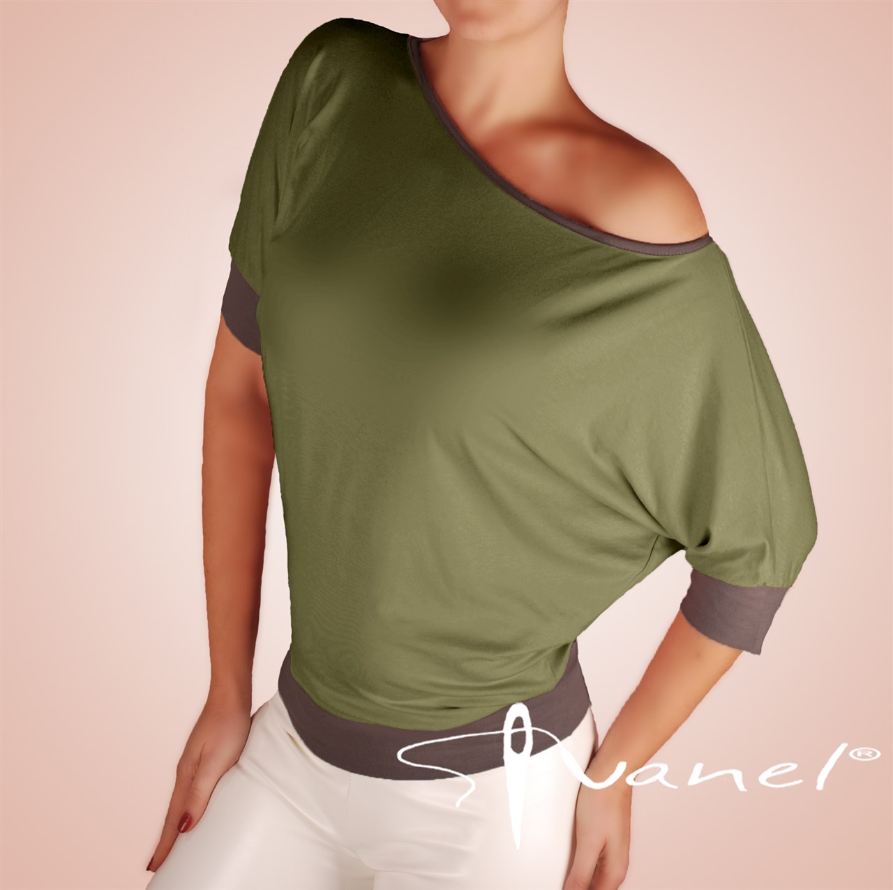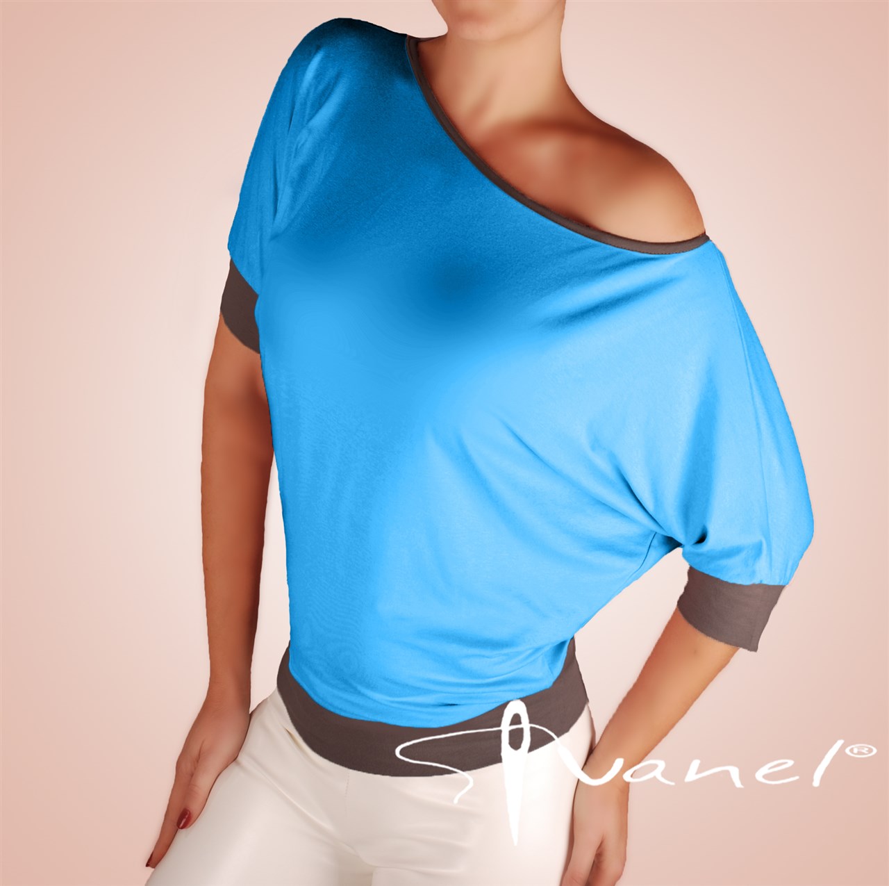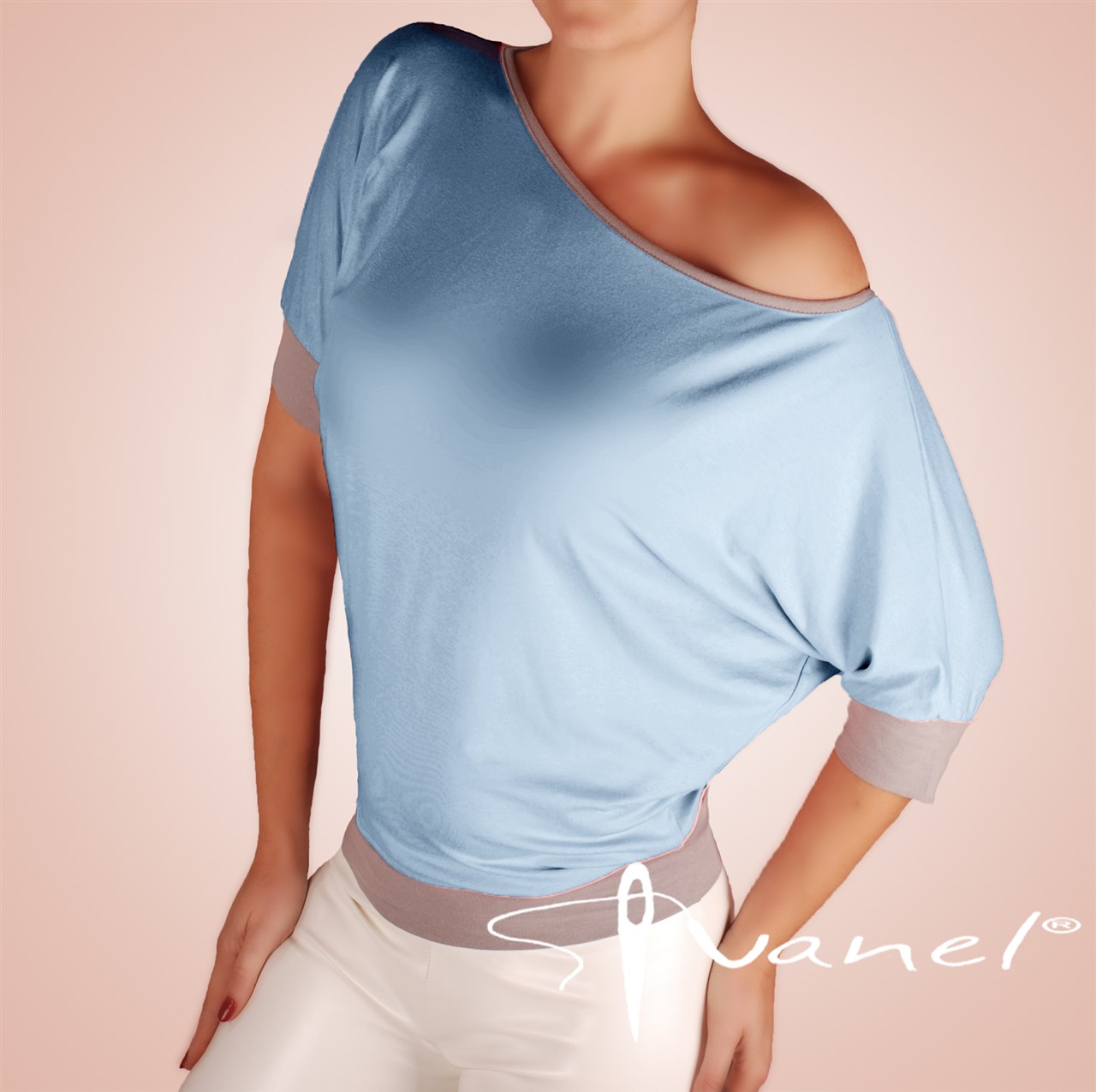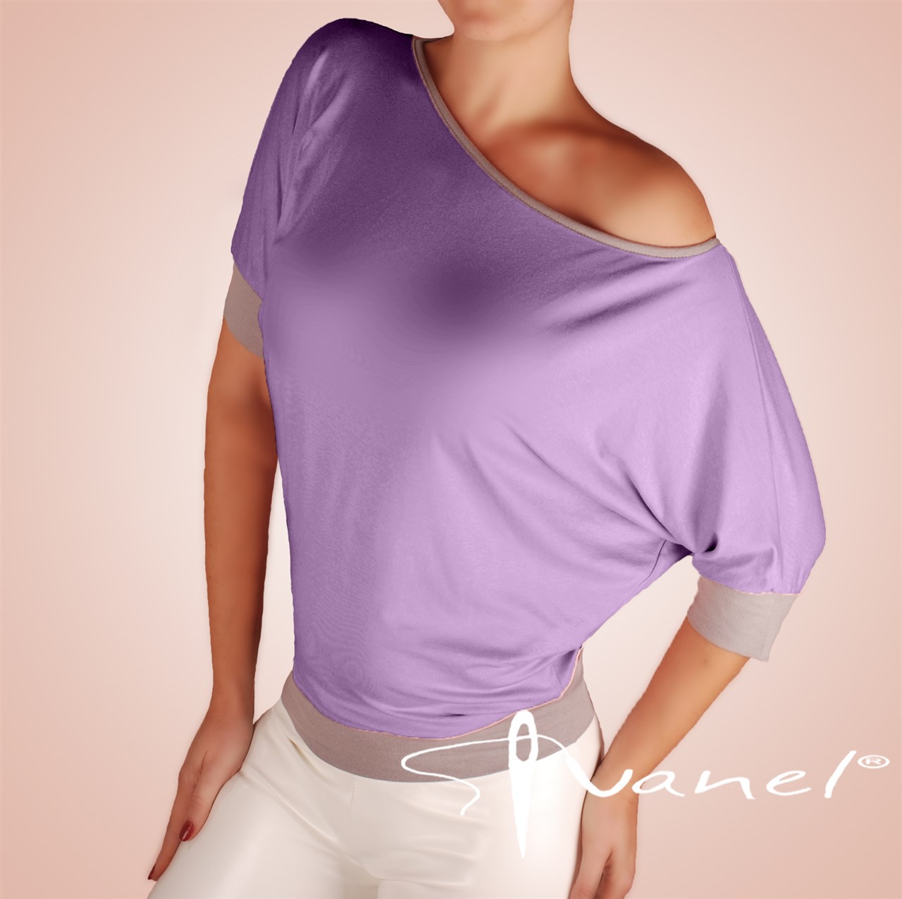 Дамска блуза с широк прилеп ръкав. Дължината на ръкавите е до лактите. Блузата може да се носи асиметрично с едно голо рамо или симетрична с равно деколте. Основата на блузата може да бъде в 28 цвята, а маншетите могат да се избират между няколко цвята. Комбинацията избирате Вие.