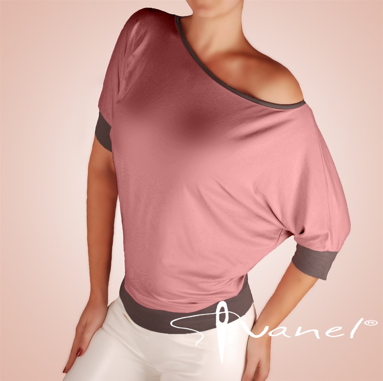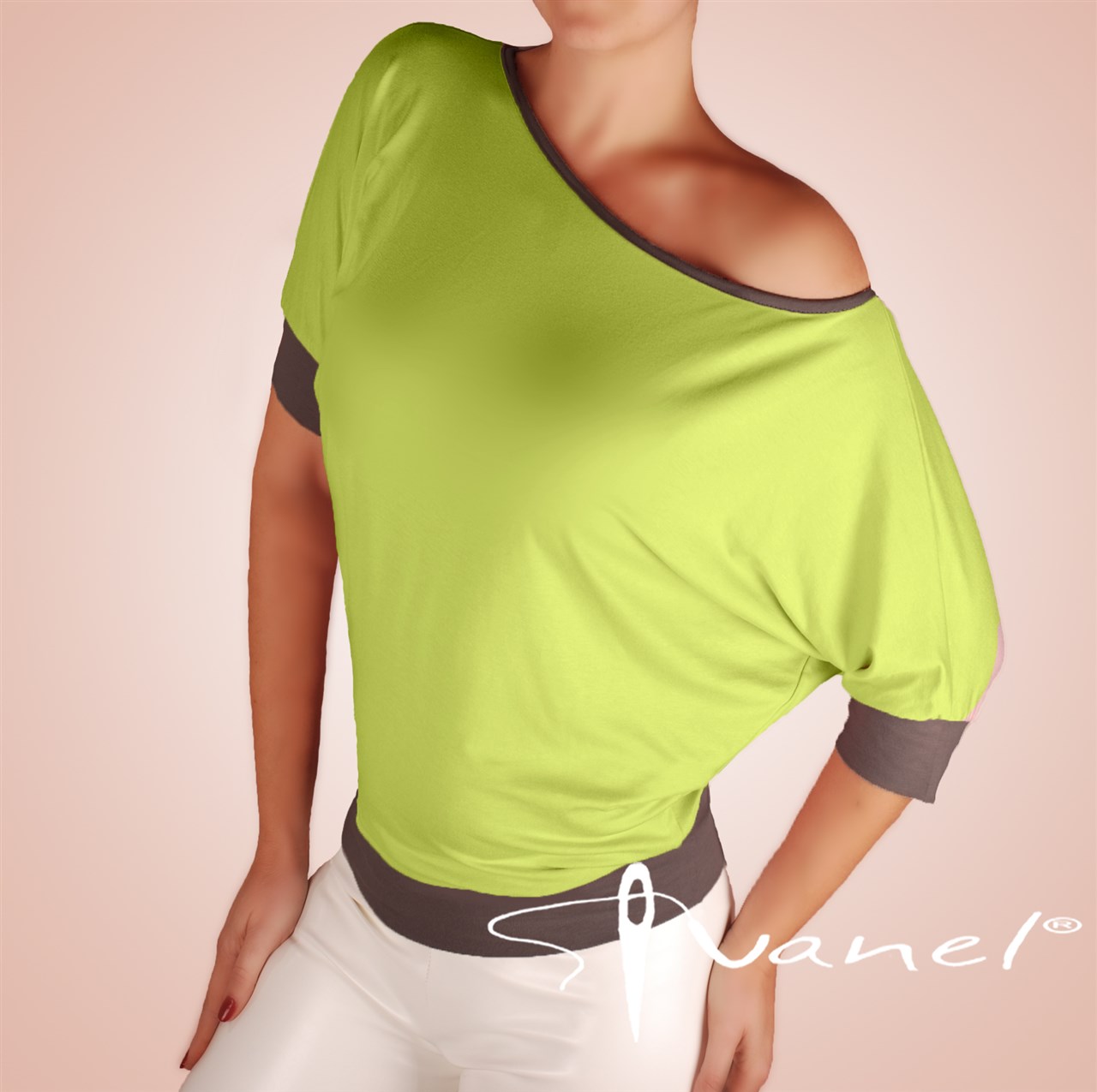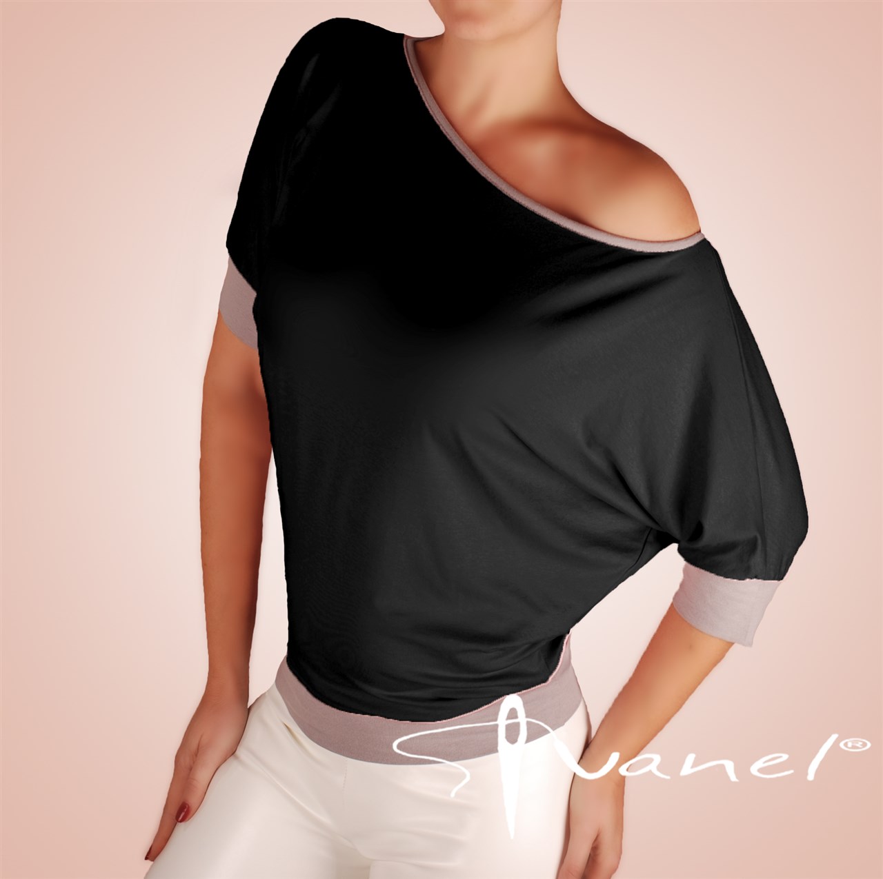 Дамска блуза с широк прилеп ръкав. Дължината на ръкавите е до лактите. Блузата може да се носи асиметрично с едно голо рамо или симетрична с равно деколте. Основата на блузата може да бъде в 28 цвята, а маншетите могат да се избират между няколко цвята. Комбинацията избирате Вие.