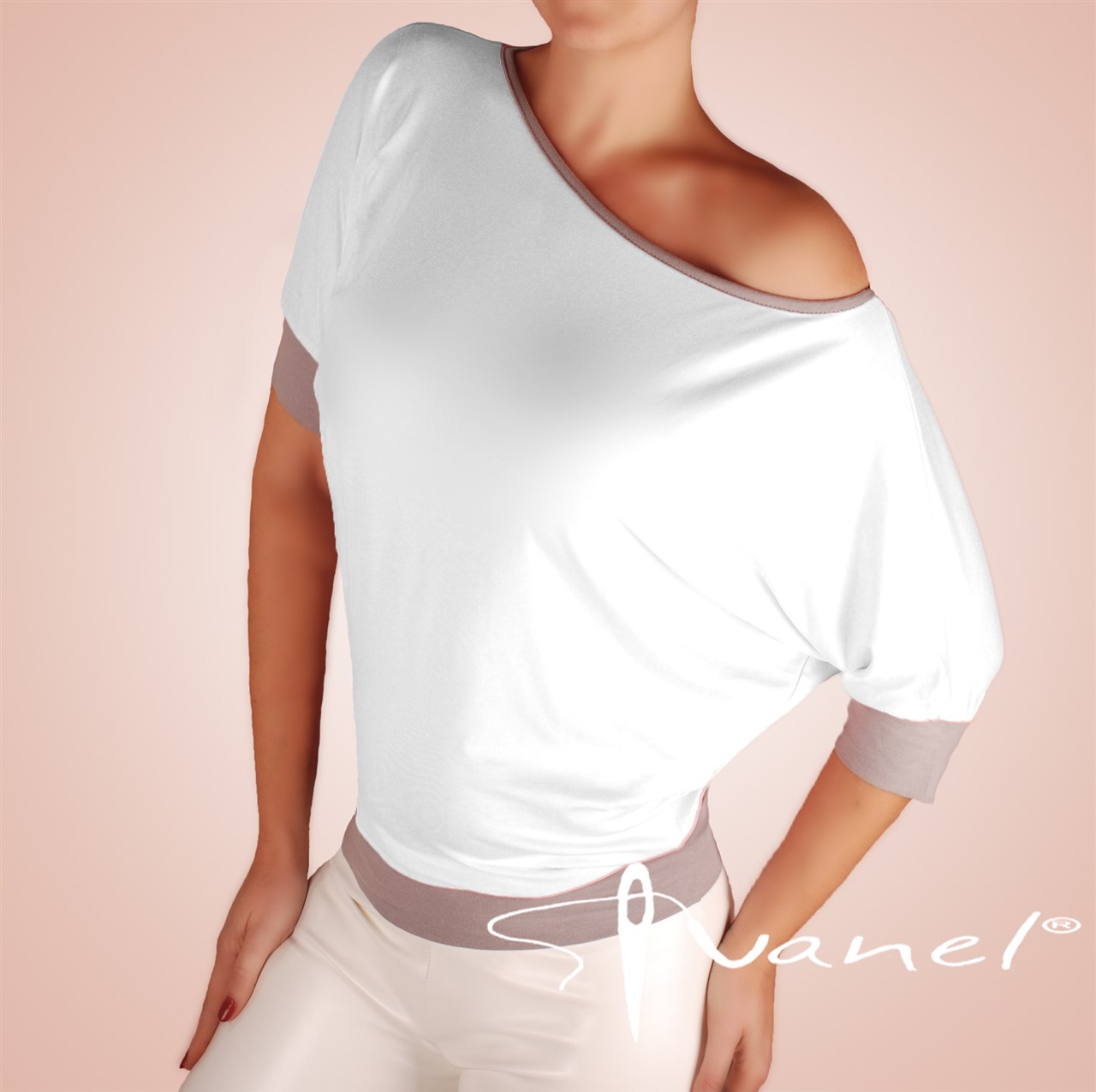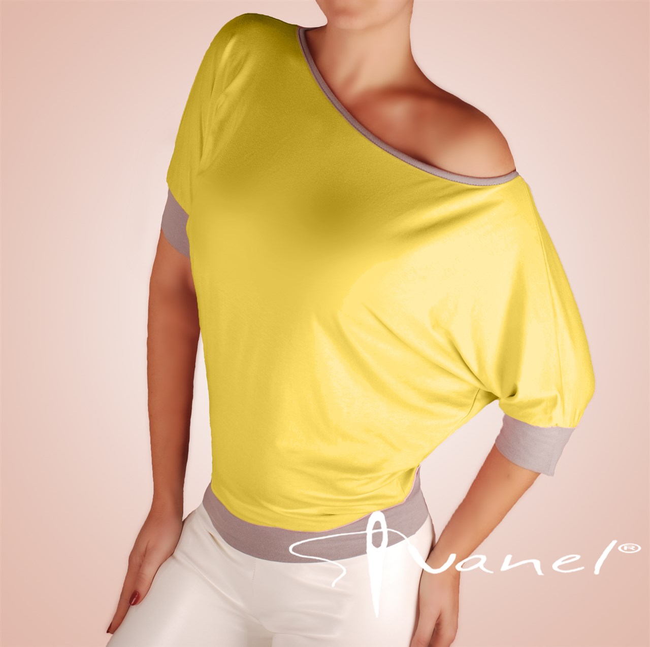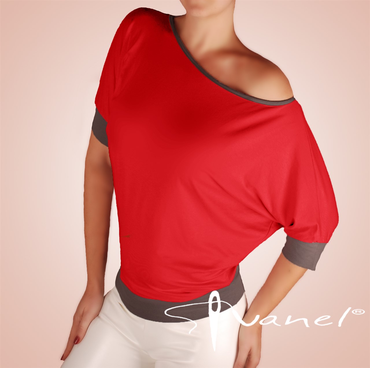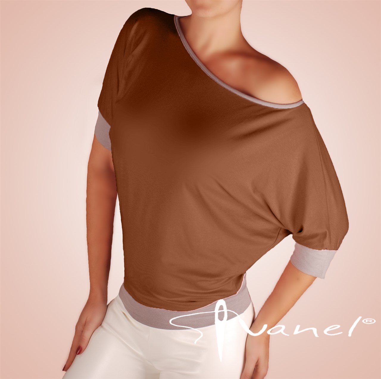 Дамска блуза с широк прилеп ръкав. Дължината на ръкавите е до лактите. Блузата може да се носи асиметрично с едно голо рамо или симетрична с равно деколте. Основата на блузата може да бъде в 28 цвята, а маншетите могат да се избират между няколко цвята. Комбинацията избирате Вие.